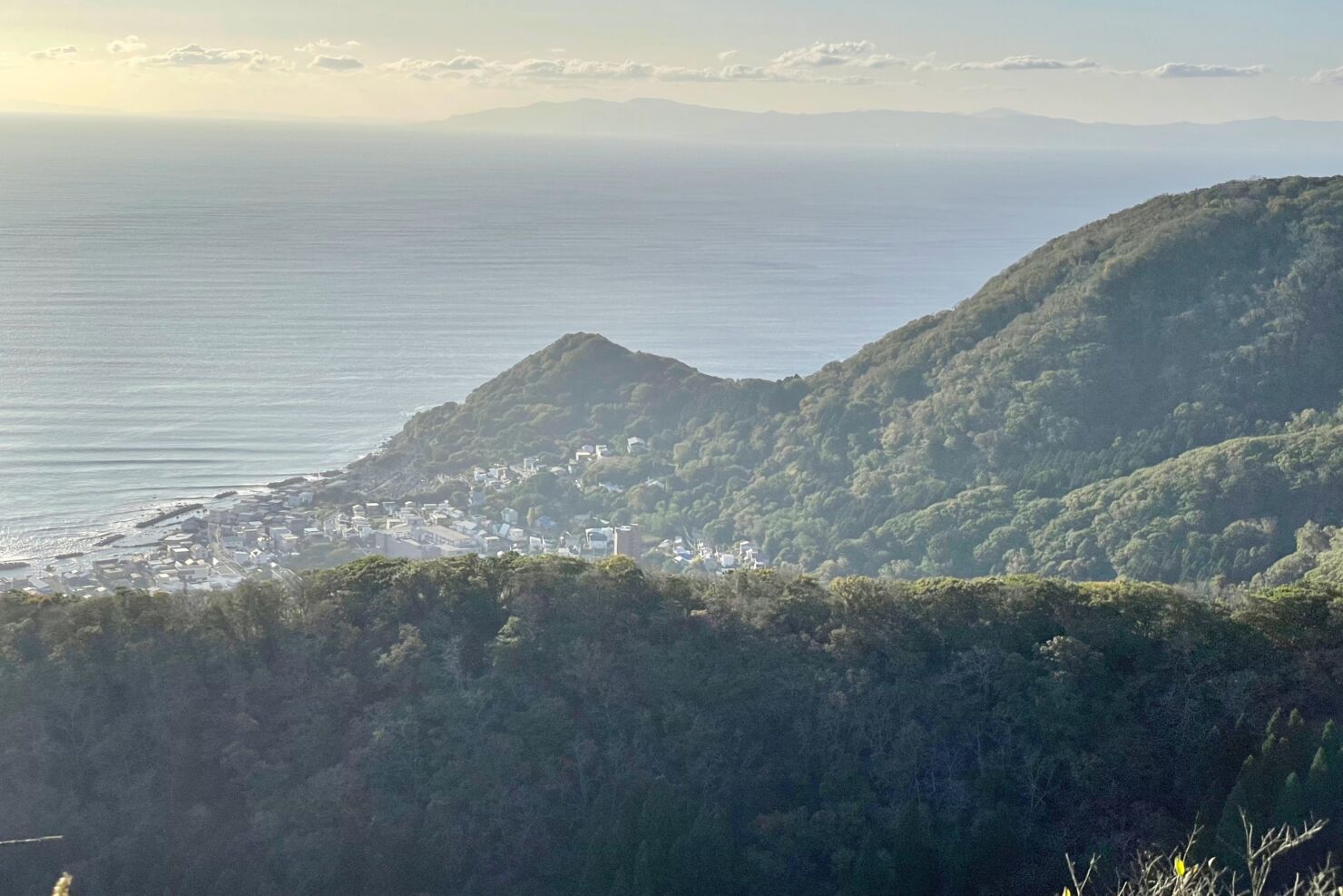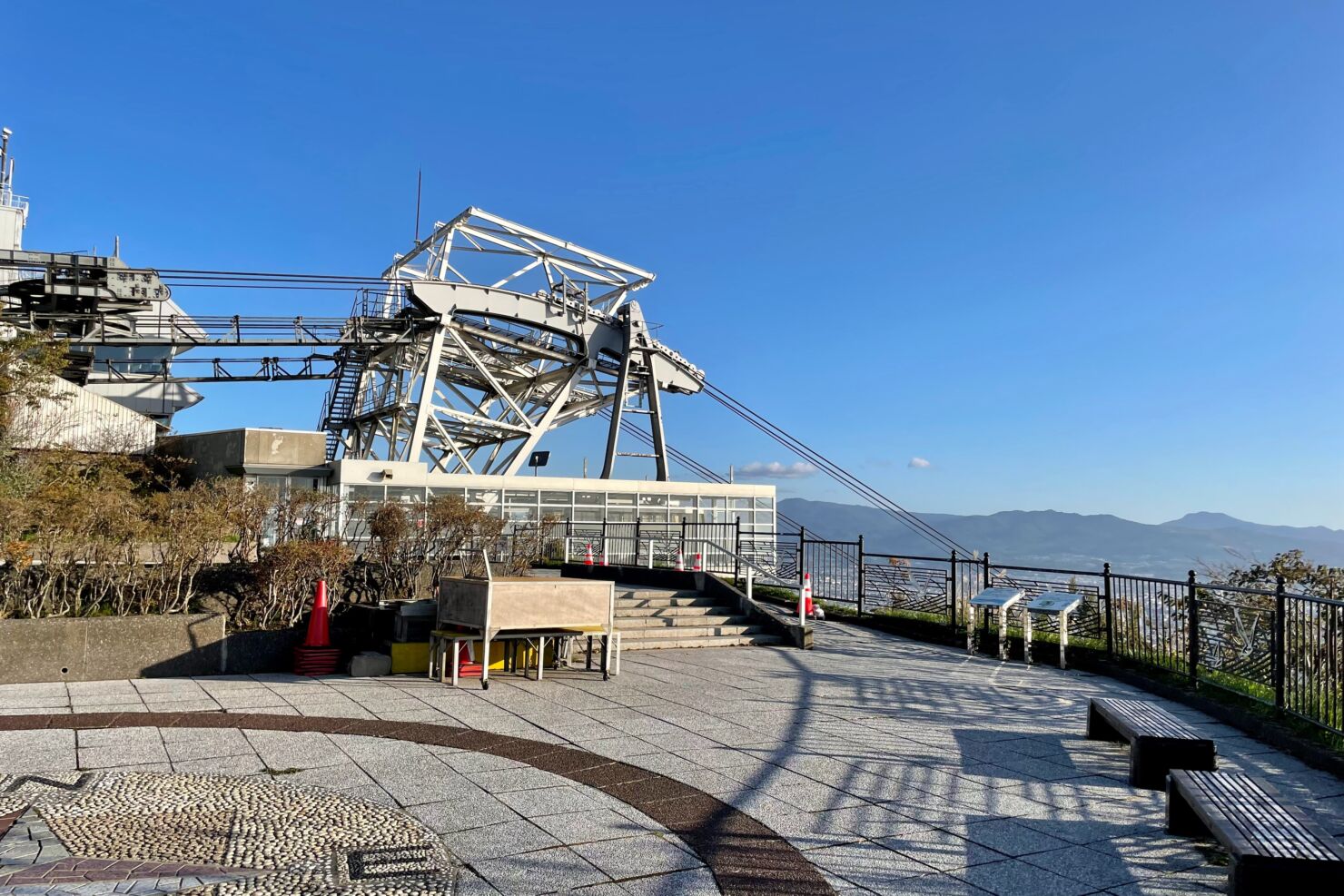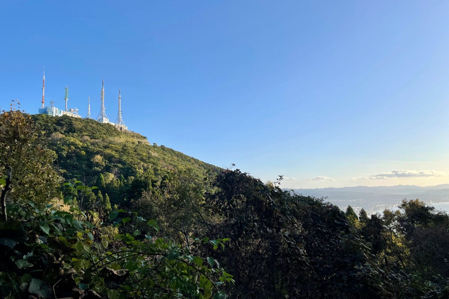 5合目(標高218m)を超えてきたあたりから、朝日側の景色が開けてきます。山頂展望台にある施設も見えてきます。もう少しでつつじ山駐車場に到着します。