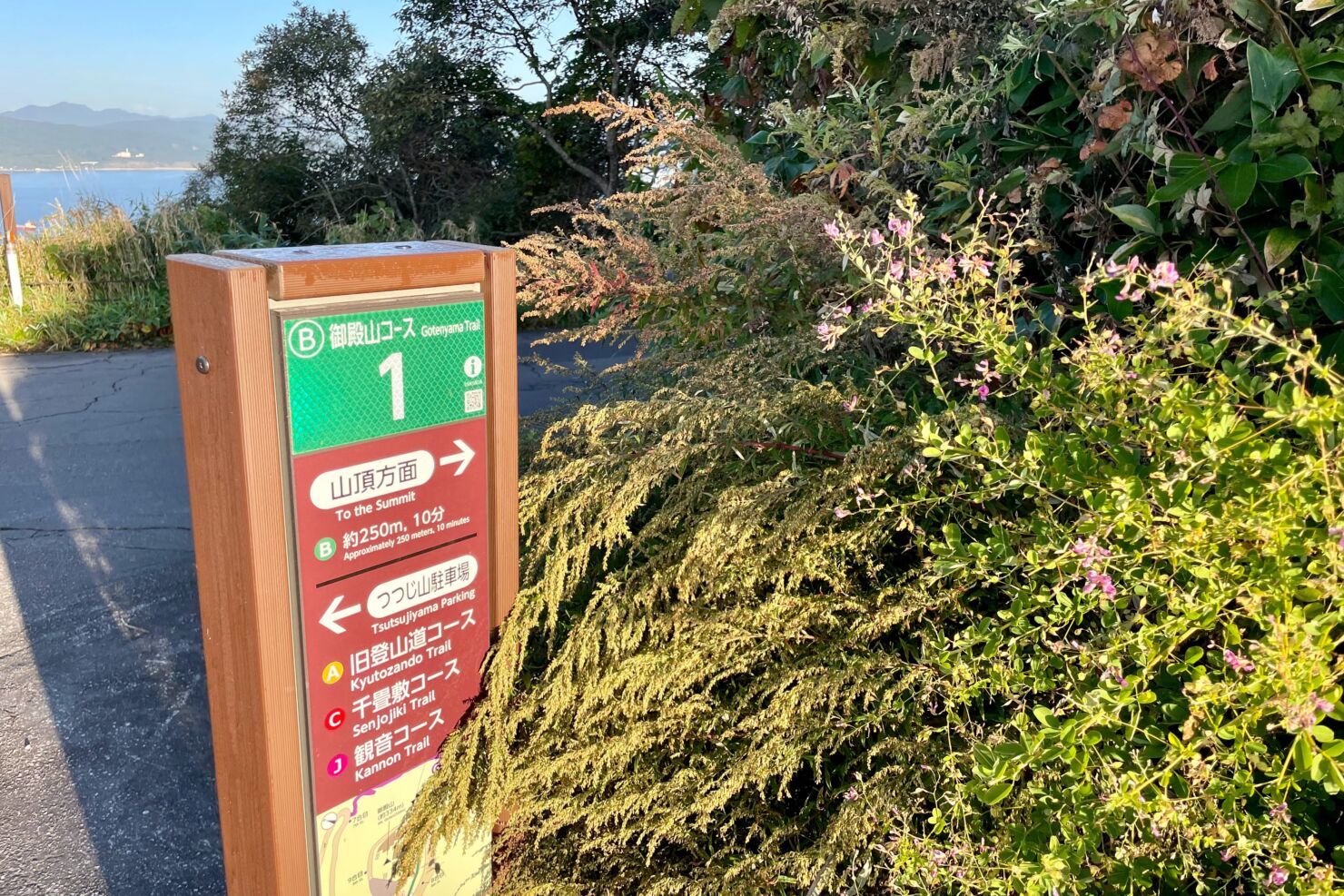 歴史ロマンを味わったら、いよいよ山頂へ。来た道を戻り、つつじ山駐車場へ。ここからさらに「御殿山コース」を進むと山頂へ到着します。時間としては10分程度です。最後の道のり頑張りましょう。