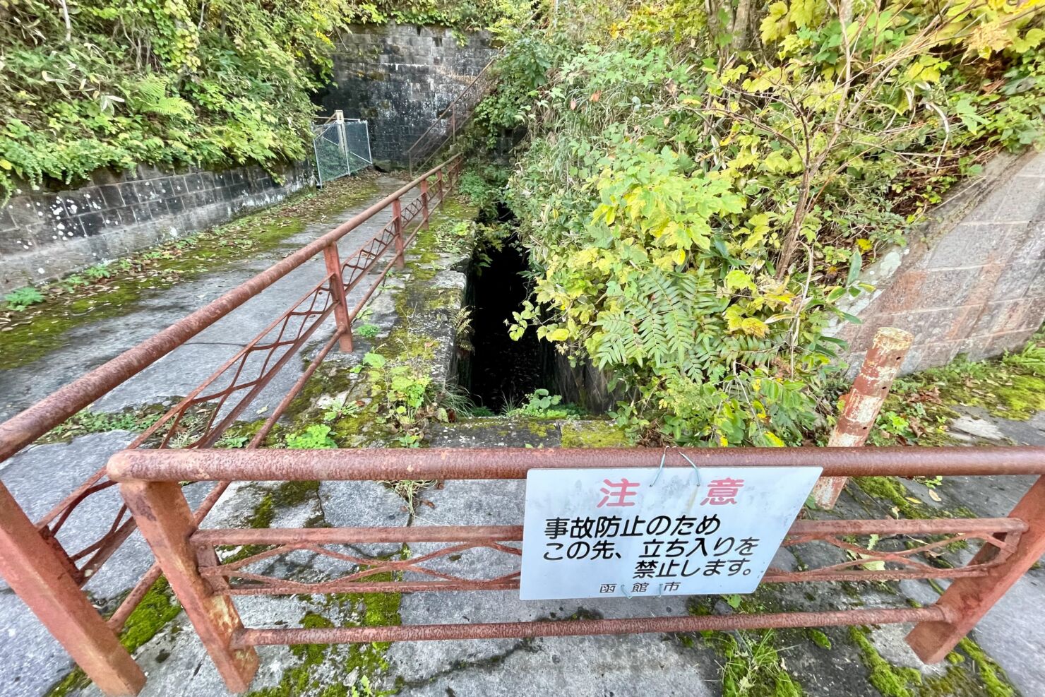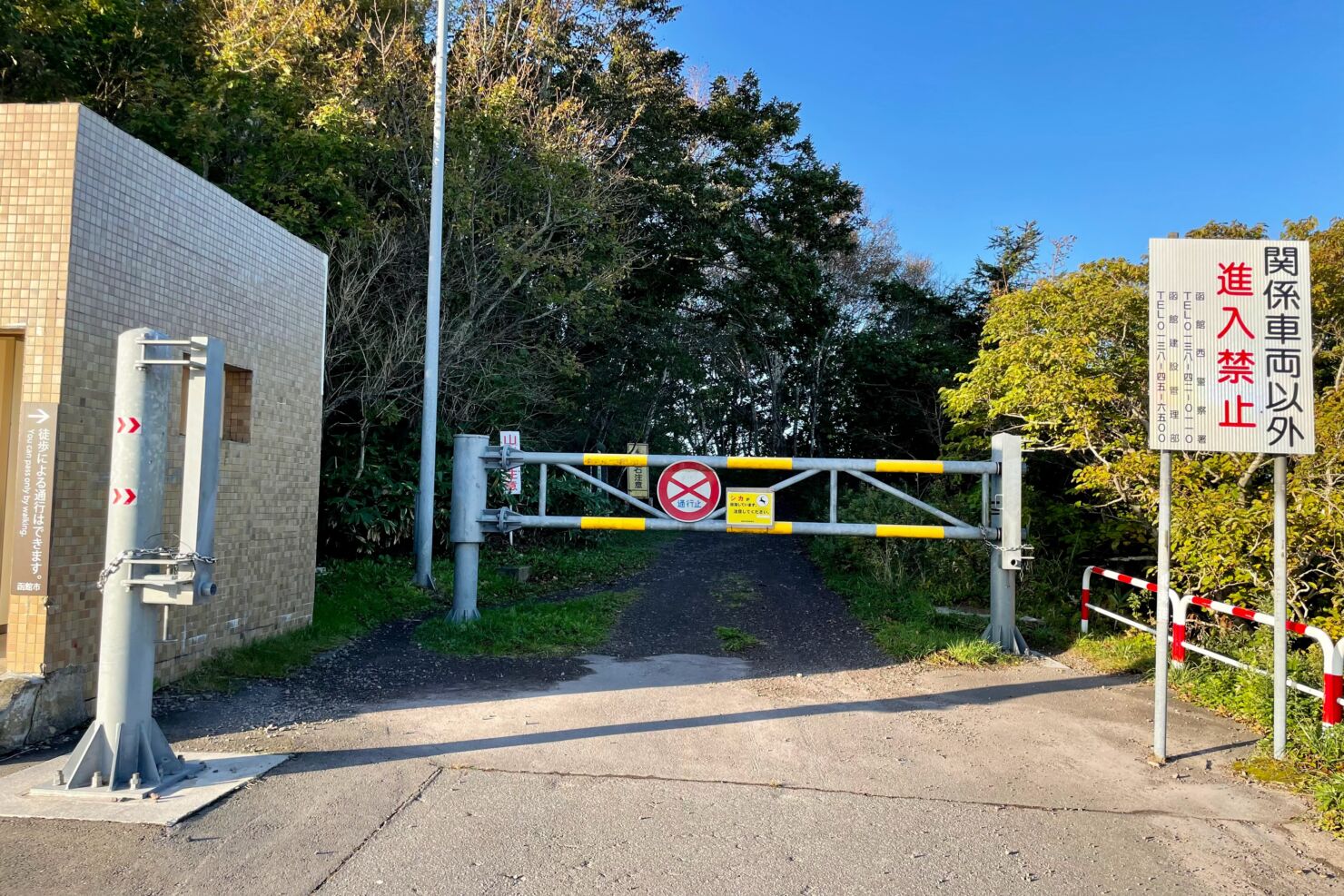 つつじ山駐車場まで来たら、展望台までは10分くらいで着きますが、函館山の歴史の一端に触れるため、少し寄り道して御殿山第2砲台跡に向かいます。少しわかりづらい道ですが、下の写真の車両通行止めのところが歩行可能になっているので、進んでいくとすぐ左手に階段があるので登っていきます。数分で砲台跡まで着きますが、道が一人分の幅しかないです。反対側から人が来た場合は譲り合いながら進みましょう。