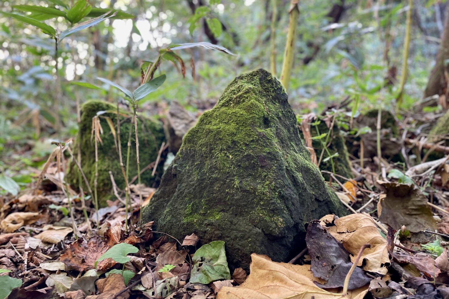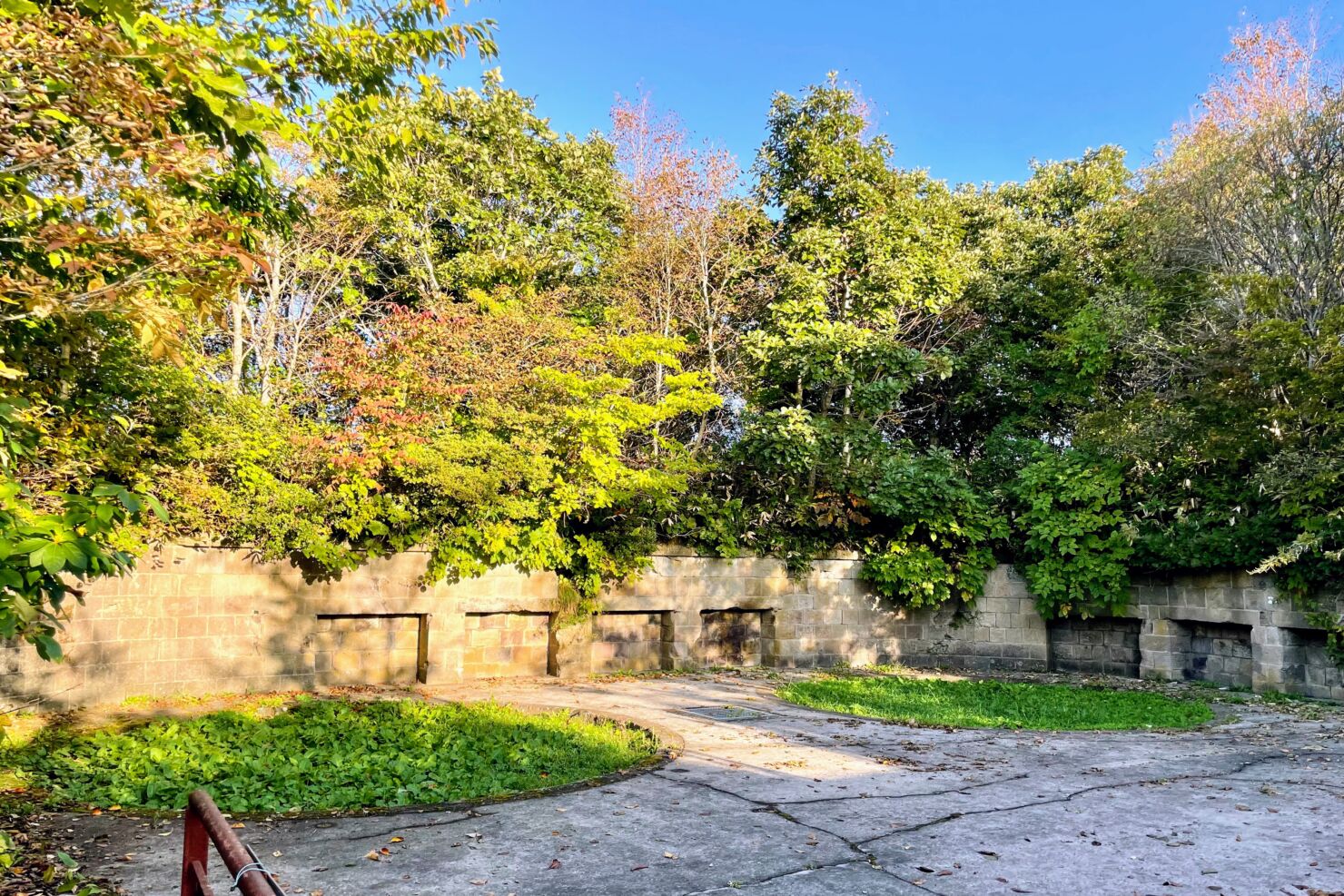今回のルートで訪れるのは御殿山第2砲台跡。草が生い茂っている丸い箇所が砲台跡です。すぐ横には法側庫へ続く階段があり、中には入れませんが、下へ続く階段を覗くことができます。同じような区画が3区画あり、砲座跡は6門分ありますが、終戦時は2門のみ設置されていたそうです。