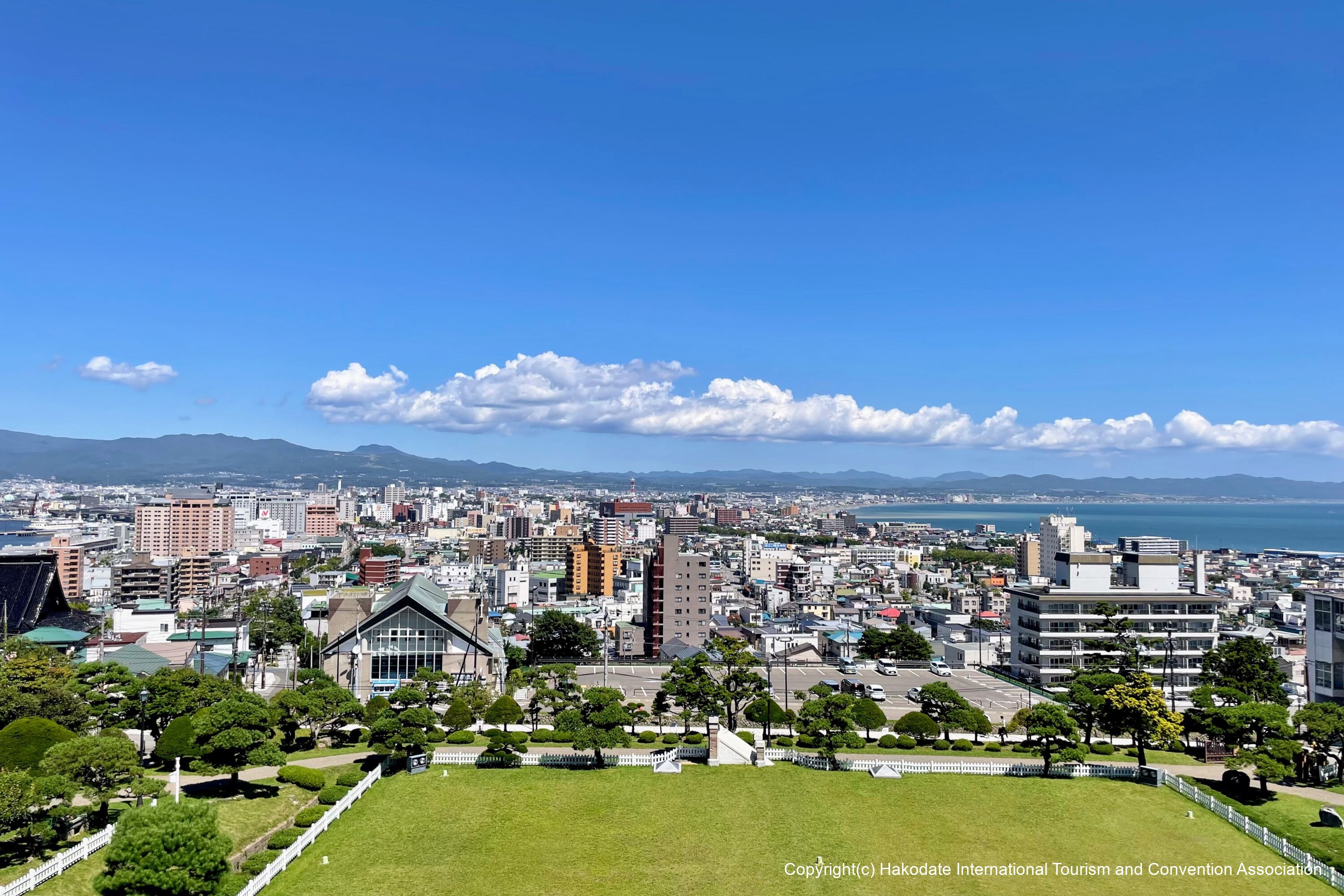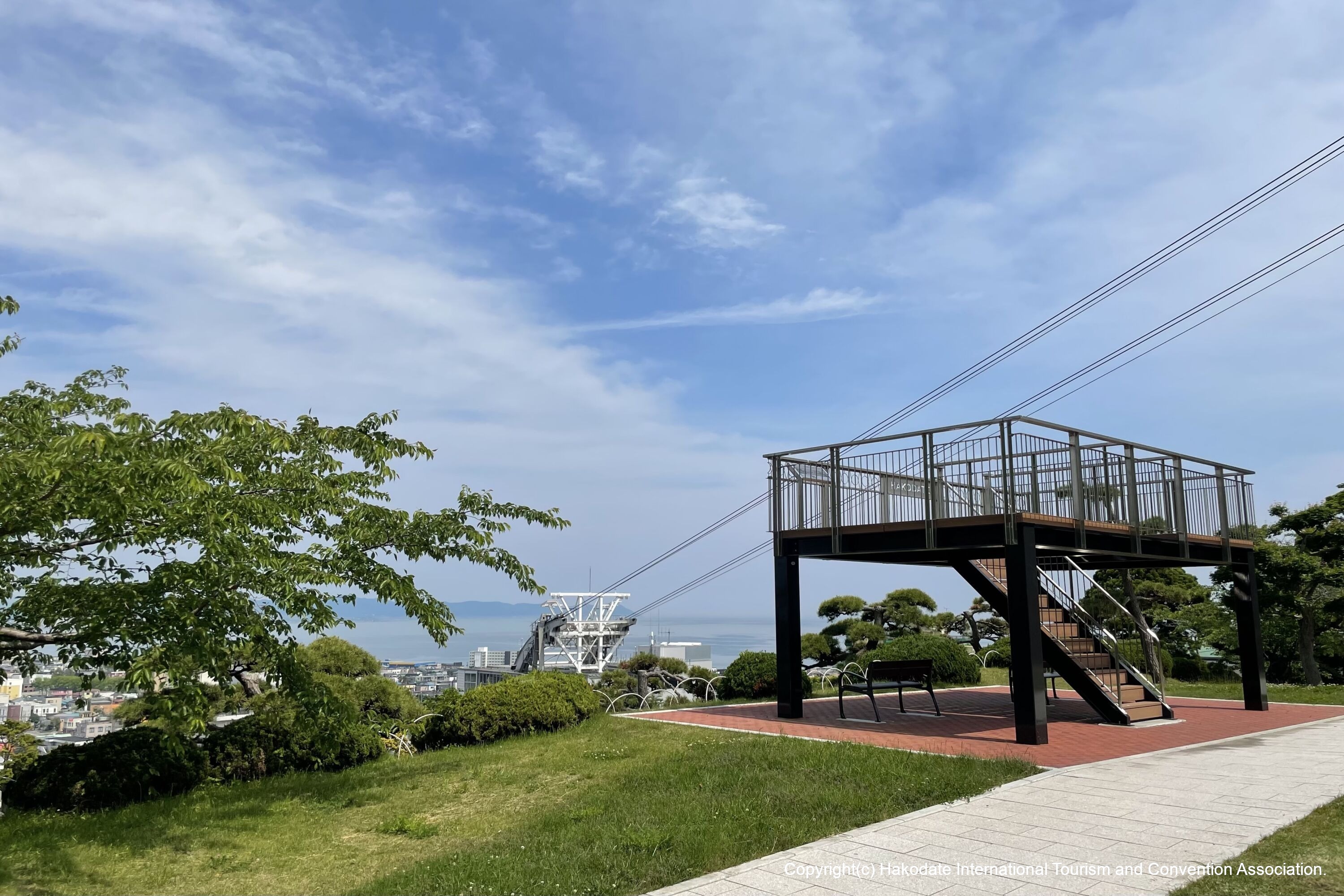 かつて道南行政の中心地として位置し、園内には北海道指定有形文化財の旧北海道庁函館支庁庁舎、旧開拓使函館支庁書籍庫が現存し、すぐ近くには重要文化財旧函館区公会堂や旧イギリス領事館があり、函館の歴史を色濃く残す公園です。高台からは函館港と市街が一望でき、ビュースポットにもなっています。