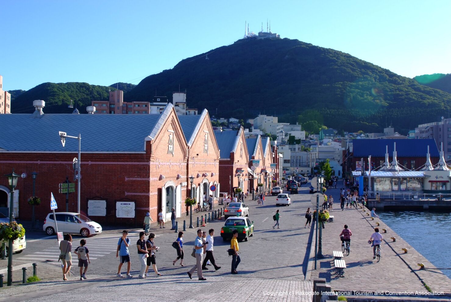 まずは函館市観光案内所から金森赤レンガ倉庫へ向かいます。函館朝市前の開港通りを進むと自転車でおよそ6分程度です。金森赤レンガ倉庫には多くのお土産屋さんや飲食店やカフェスペースのあるスイーツ店が入っています。ふらっと建物の中を見て周るのも楽しいです。