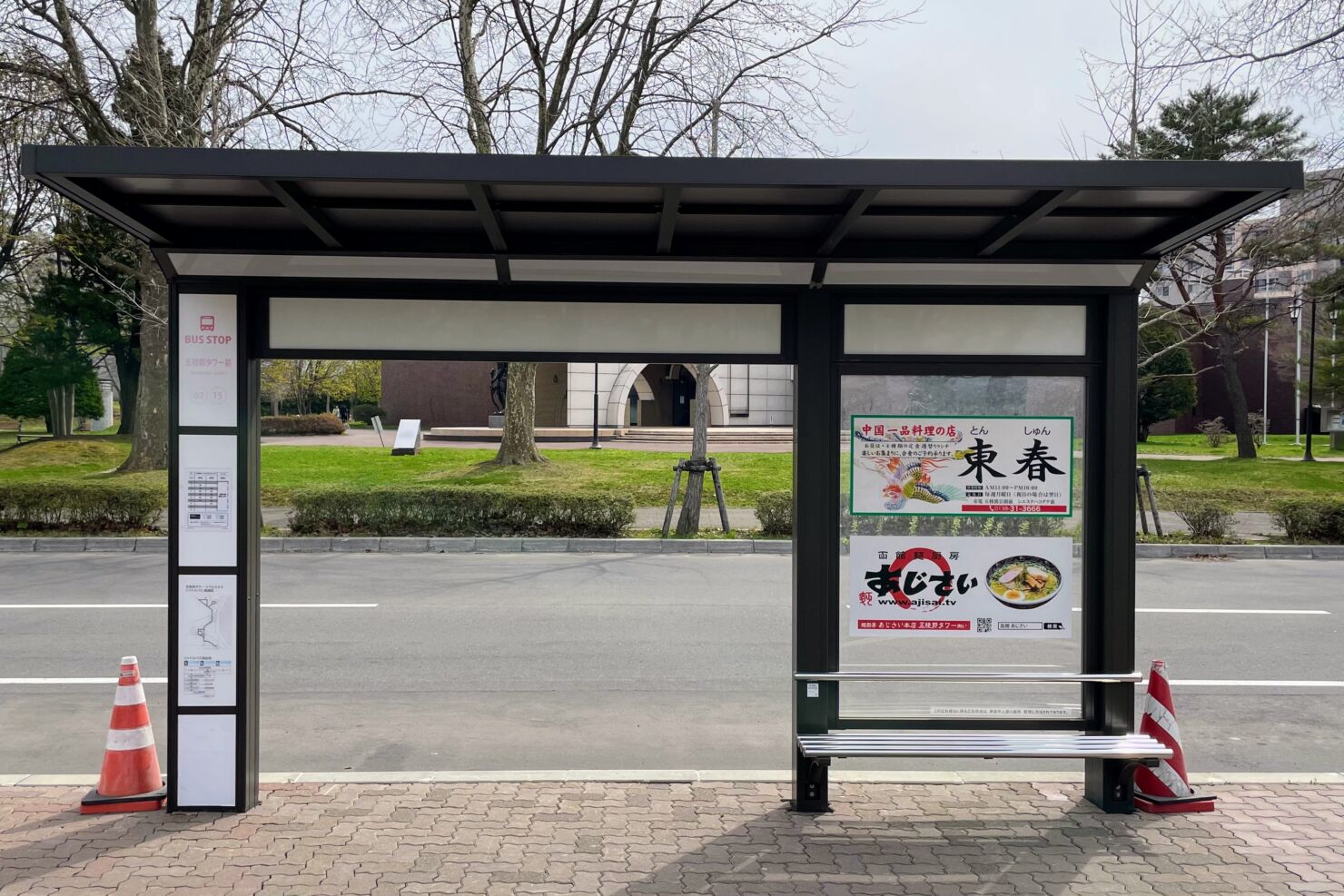 JR函館駅の改札をくぐり、正面入り口を出るとすぐ斜め左側が駅前バスターミナルになっています。赤いオブジェを超えて、正面方向へ歩き、ターミナルに沿って1番のりば、2番のりば・・・4番のりばを目指します。