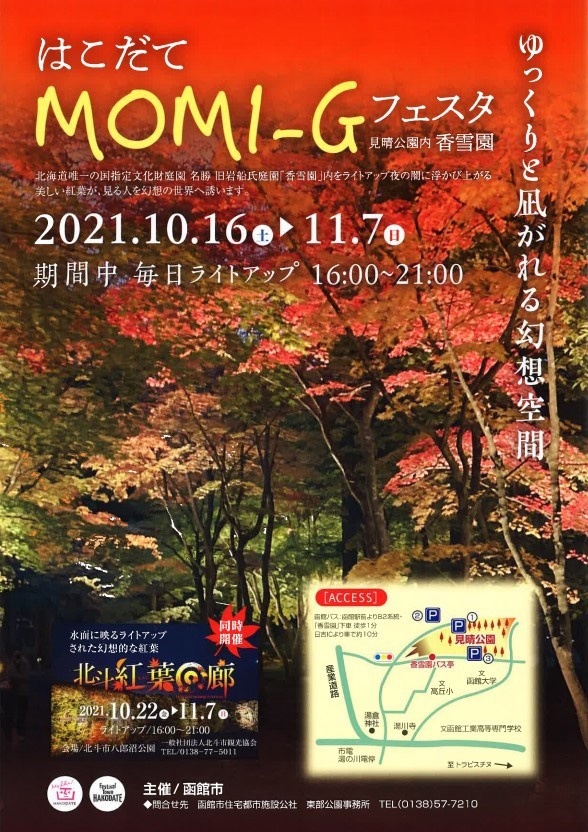 函館の紅葉名所である香雪園(見晴公園)で「はこだてMOMI-G(もみじ)フェスタ」が開催されます。