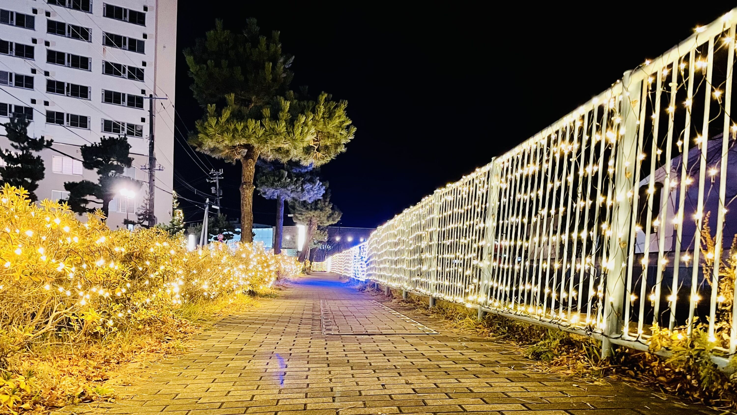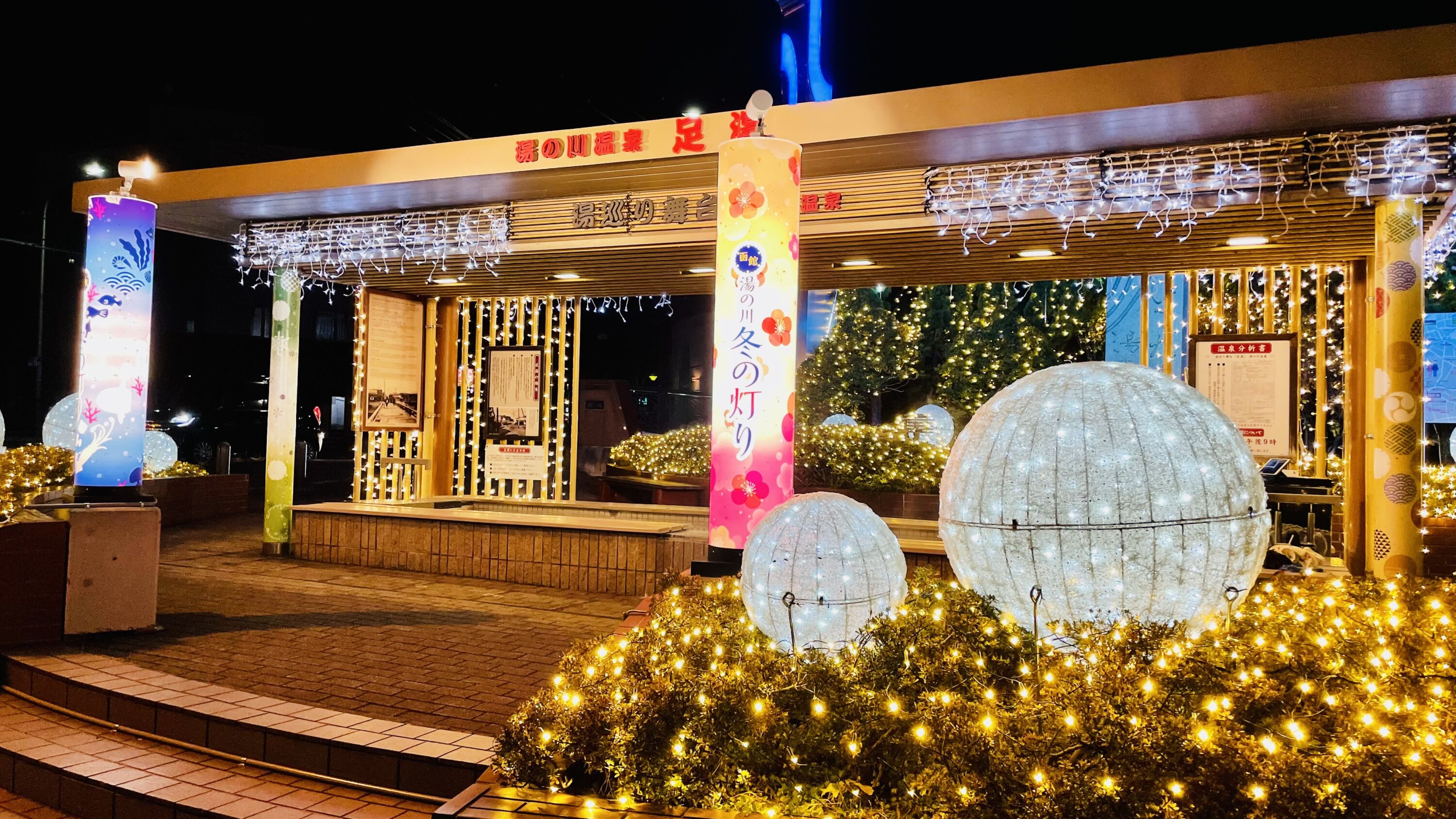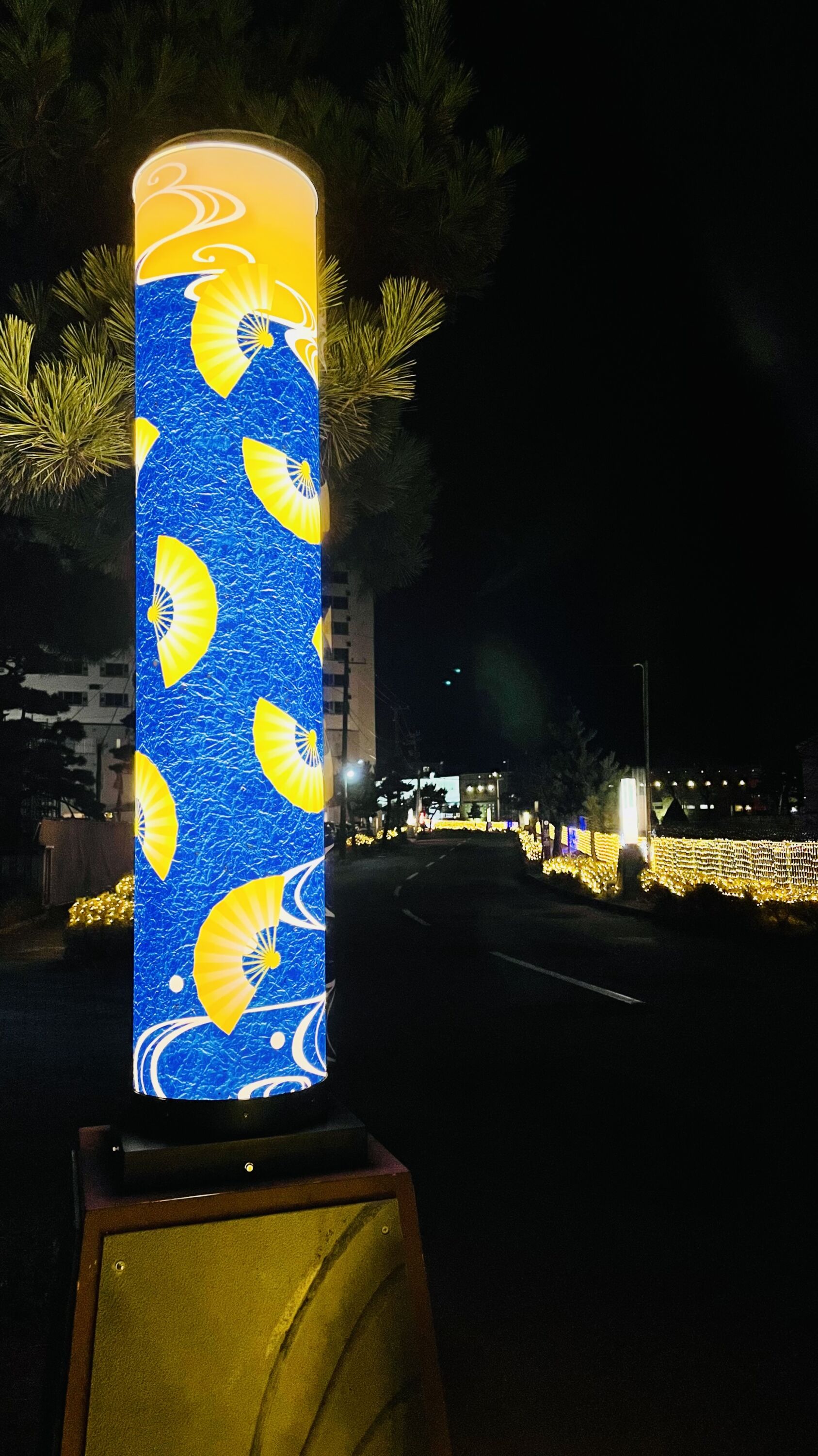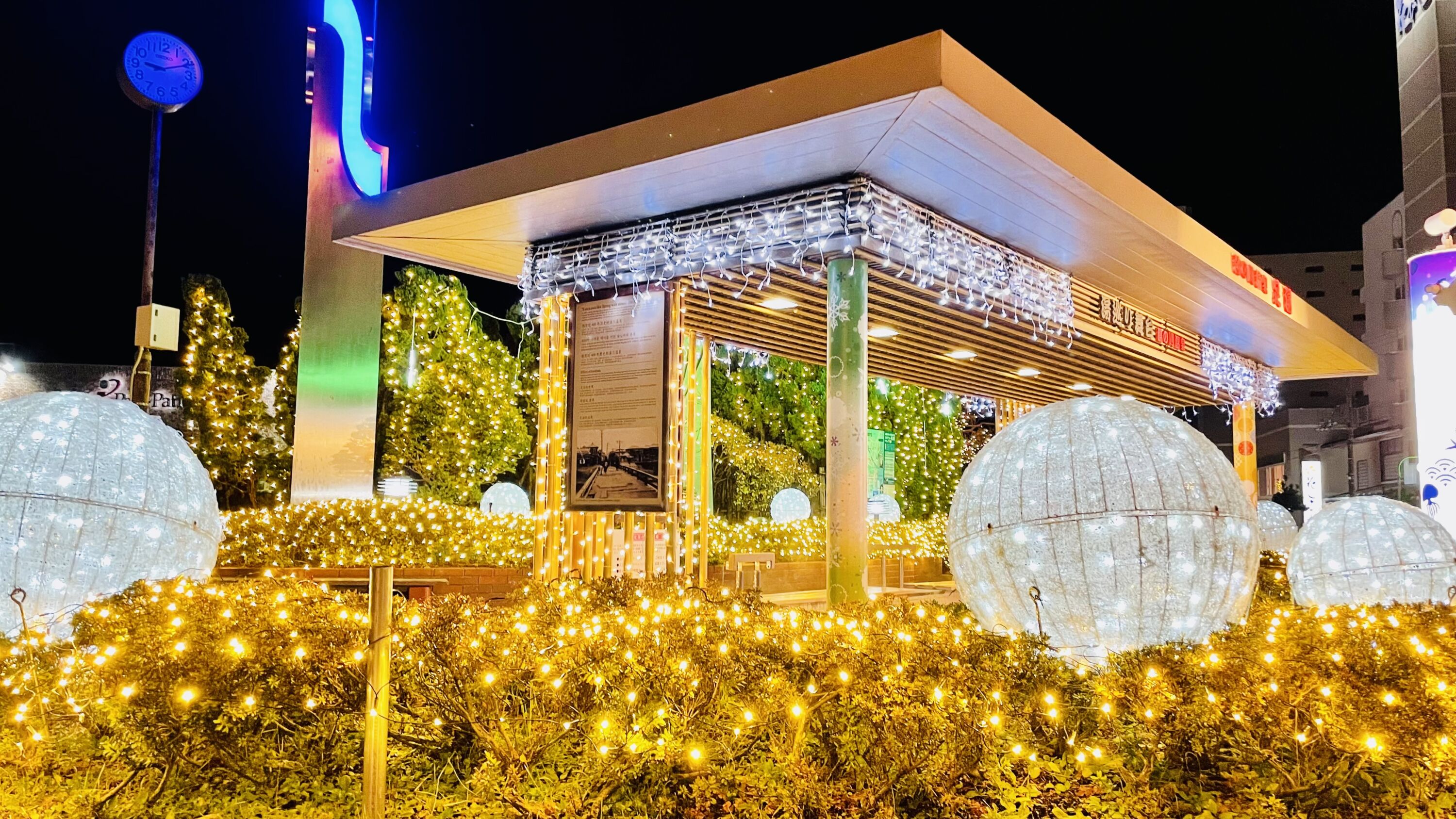 北海道三大温泉郷のひとつとして数えられる湯の川温泉。その温泉街が色鮮やかな光に包まれます。イルミネーションエリアは、ゆっくり足湯を楽しむことができる”湯巡り舞台”から鮫川沿いの道路で、片道10分程度の道のりです。日本伝統の木工技術「組子」文様をイメージした灯篭や、和テイストの絵柄の円柱型モニュメントが設置されており、「和とモダン」が融合された煌びやかな光の競演を楽しむことができます。