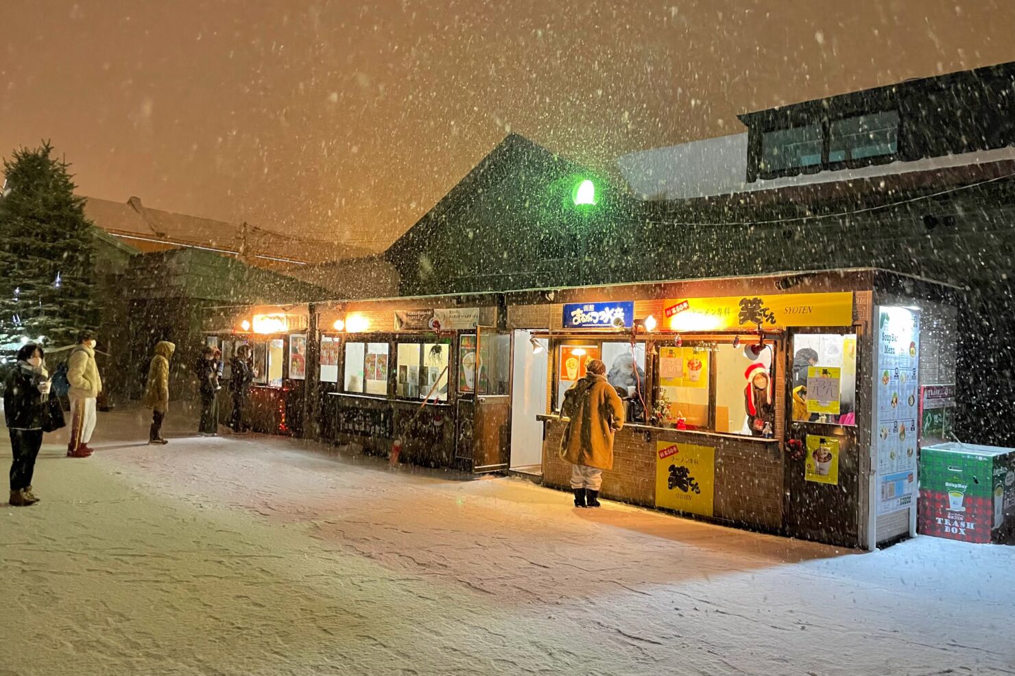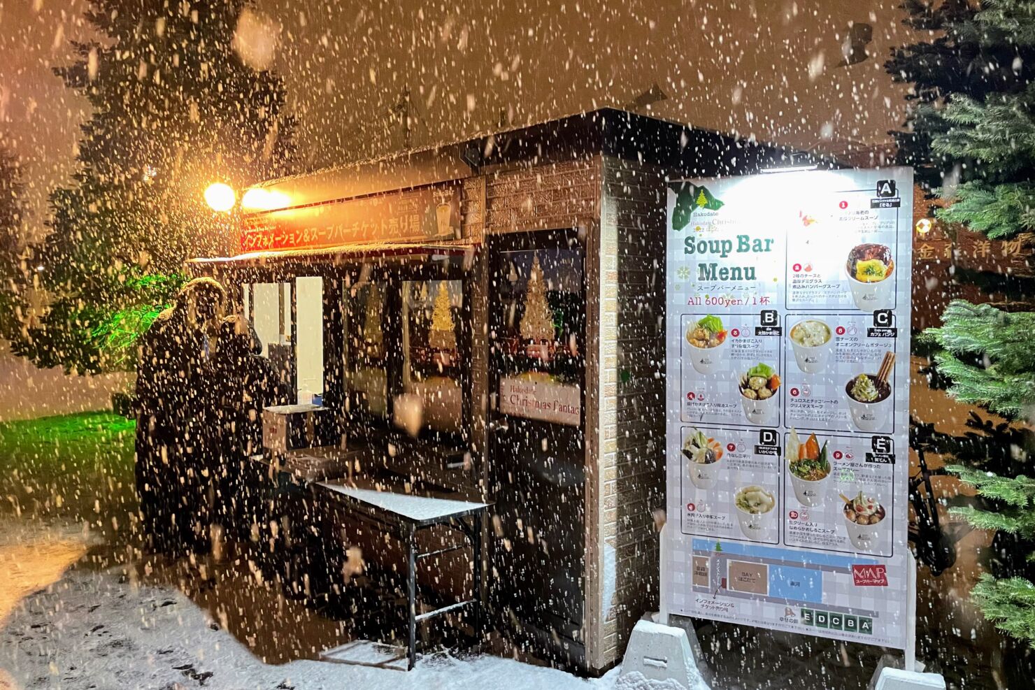 チケット売り場は、クリスマスツリーを背にして、スープバー出店場所(BAYはこだてイベント広場)へ進む途中、BAYはこだて側通路上にあります。スープを楽しみたい方は、こちらで1枚(1杯)600円のスープバーチケットを購入できます。また、前売りスープバーチケット抽選券を入れる箱もこちらに設置されています。