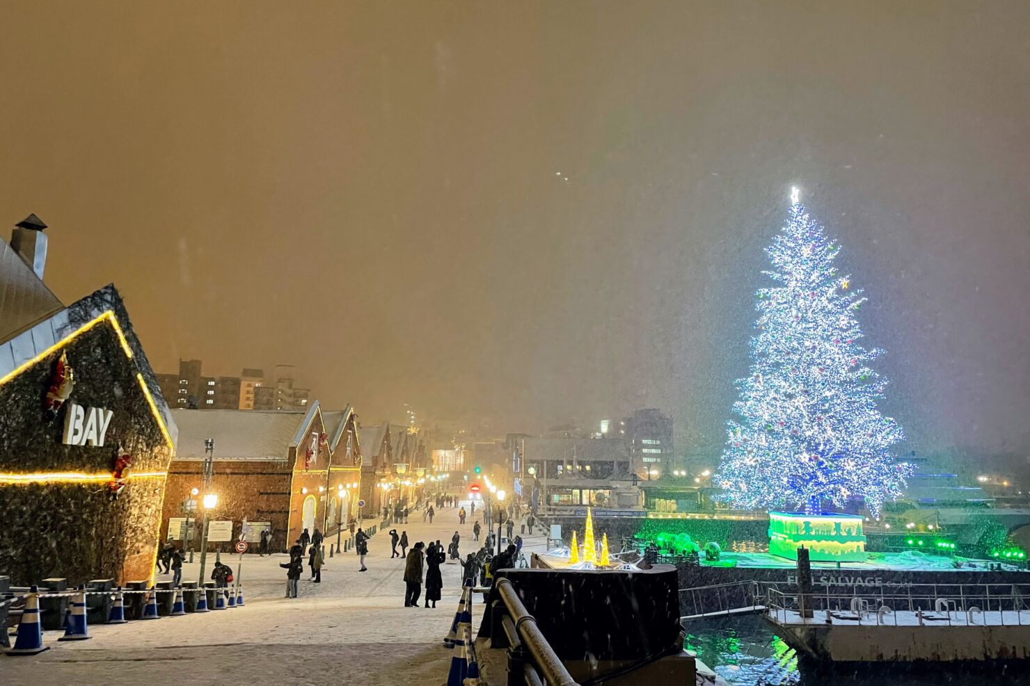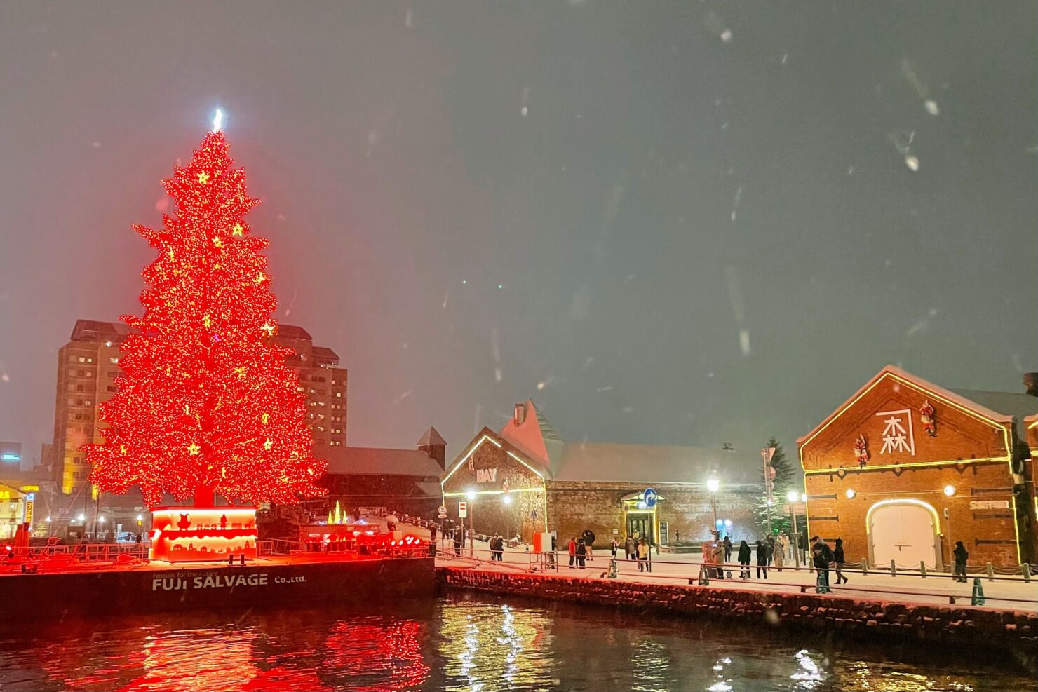 ラッキーピエロマリーナ末広店や観光遊覧船ブルームーン(今年度の運行は終了済み)が停泊している方面から撮影。1日3回、各15分だけクリスマスツリーが真っ赤に輝きます。
