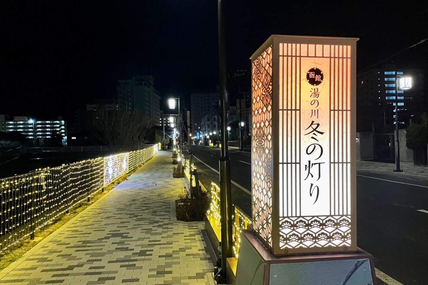 北海道三大温泉郷のひとつとして数えられる湯の川温泉。その温泉街が色鮮やかな光に包まれます。イルミネーションエリアは、ゆっくり足湯を楽しむことができる”湯巡り舞台”から鮫川沿いの道路で、片道10分程度の道のりです。日本伝統の木工技術「組子」文様をイメージした灯篭をメインに「和とモダン」が融合された煌びやかな光の競演を楽しむことができます。
