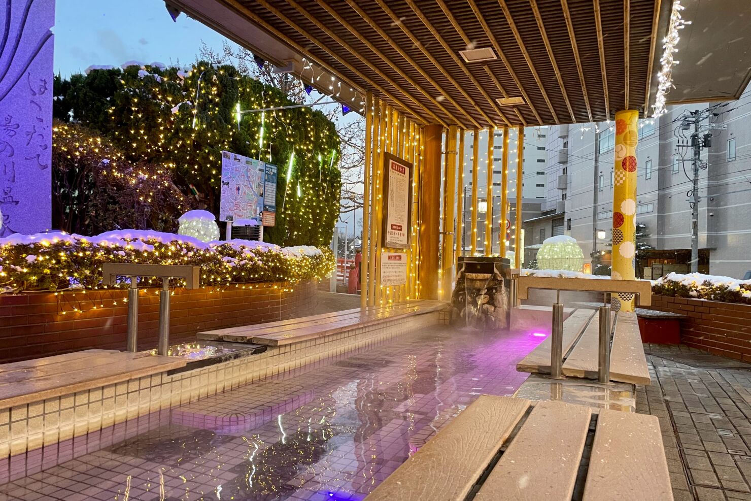 足湯は9:00 - 21:00で利用できます。濡れた足を拭くタオルをお忘れなく。