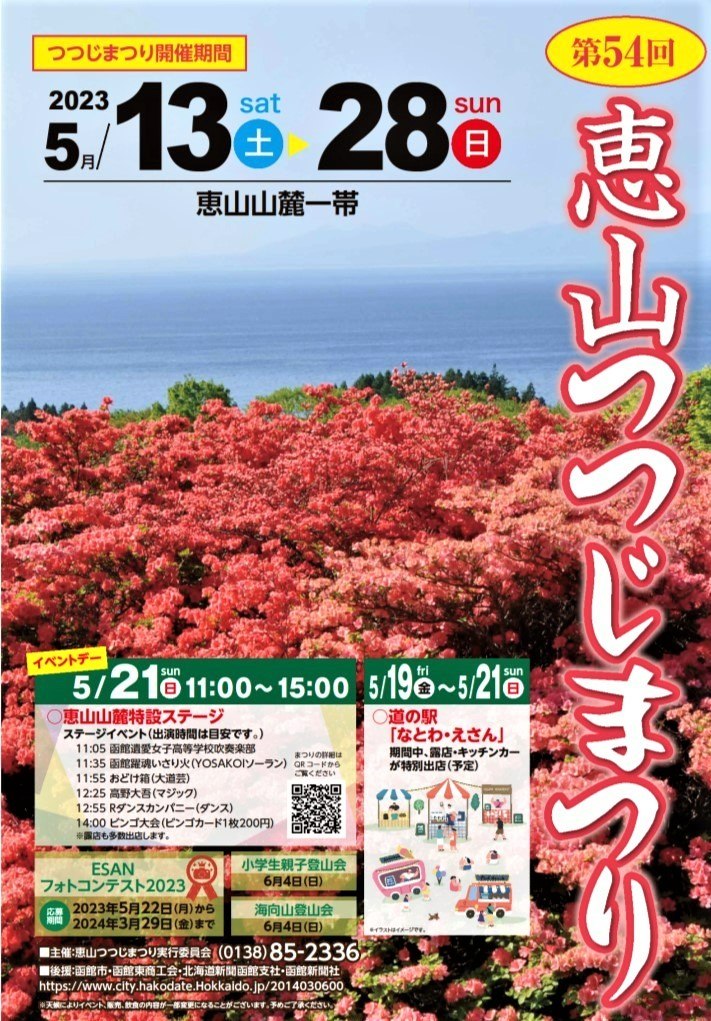 2023年5月21日のステージイベント開催の可否については、内容変更がある場合は、このページ下部に記載の「第54回恵山つつじまつり(2023年)(函館市公式HP内)」のページで当日の午前7時頃にお知らせされます。