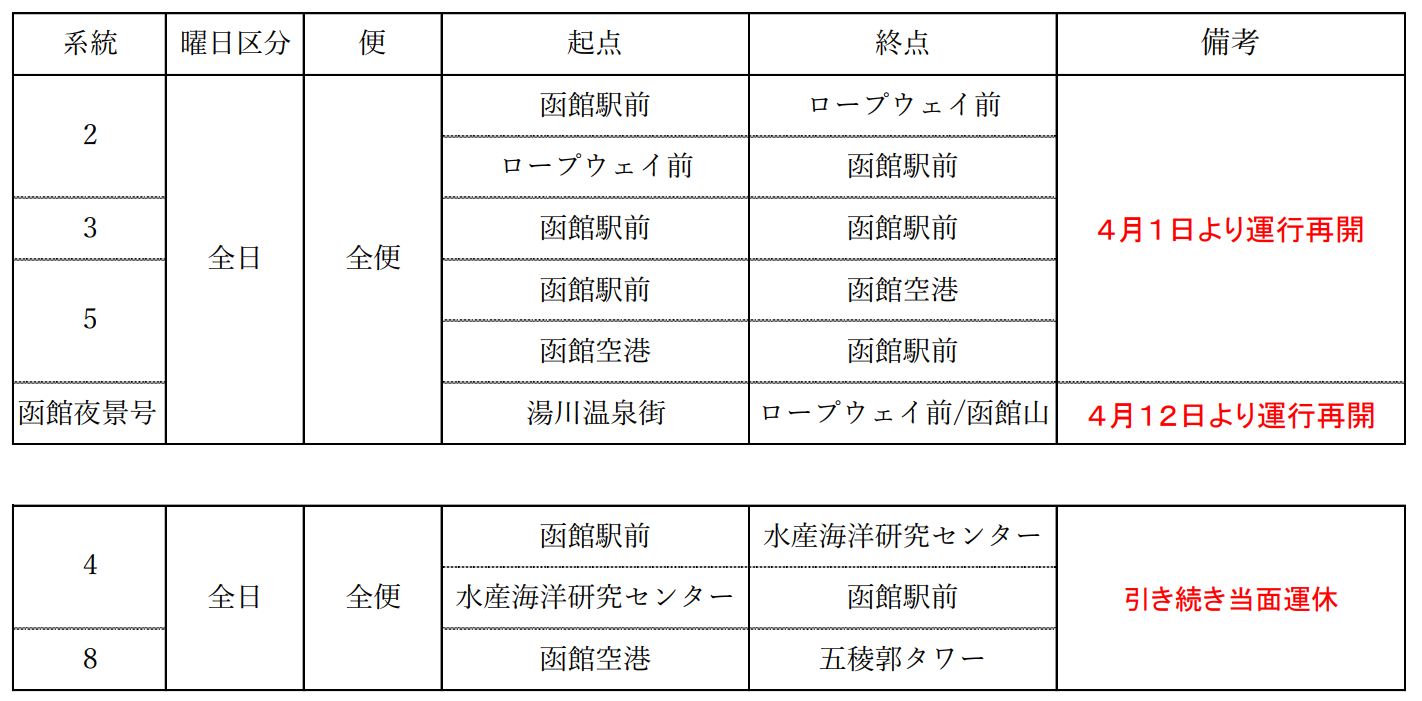 一部路線バスの減便・運休を行っていた函館バスですが、令和3年4月1日(木)から下記の通り一部路線を除き運行が再開されます。