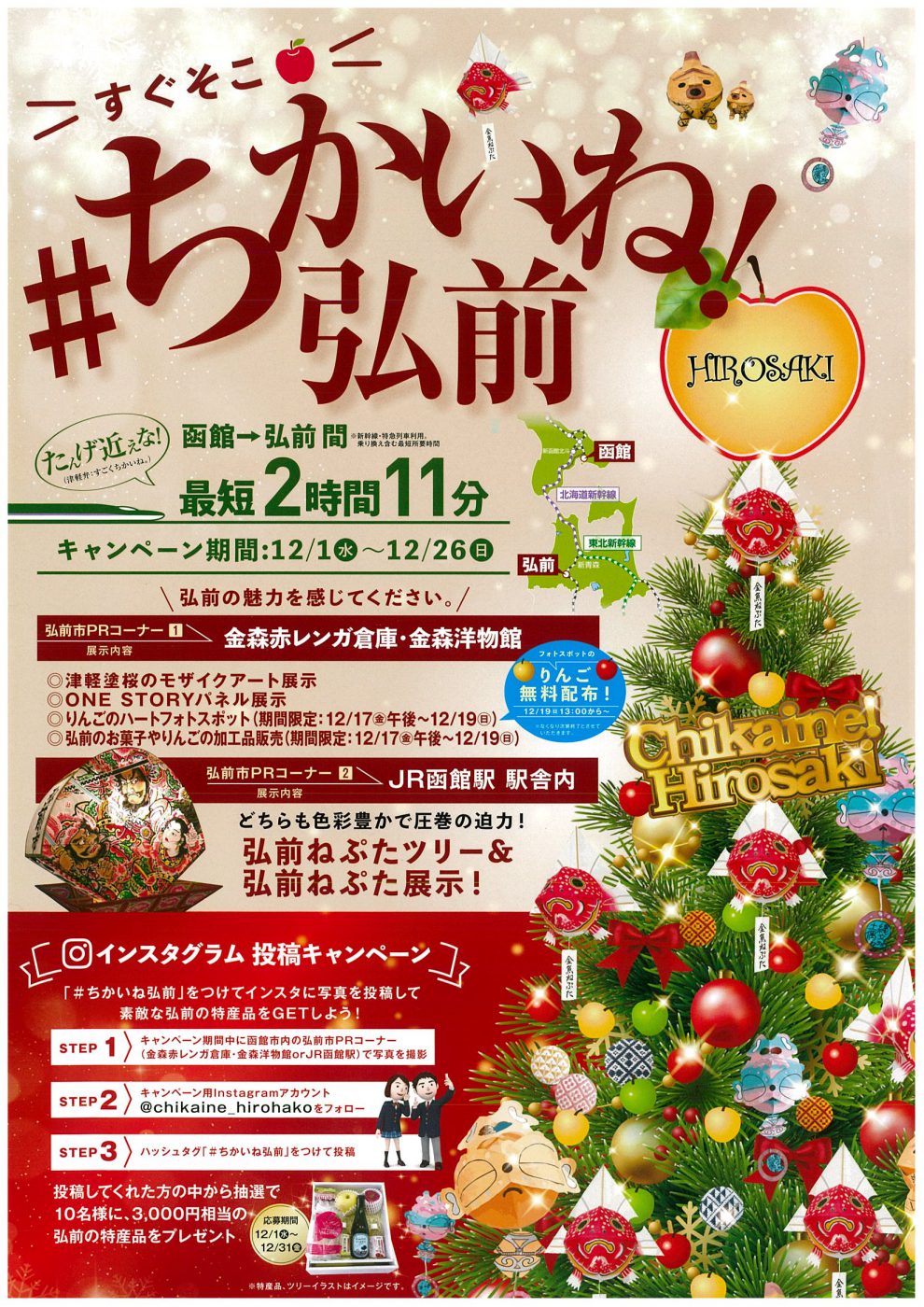 | 内 容 | ◎津軽塗桜のモザイクアート展示 ◎ONE STORYパネル展示 ◎りんごのハートフォトスポット ※期間限定:12/17(金)午後~12/19(日) ◎弘前のお菓子やりんごの加工品販売 ※期間限定:12/17(金)午後~12/19(日) ◎りんご無料配布 ※期間限定:12/19 13時~無くなり次第終了 |