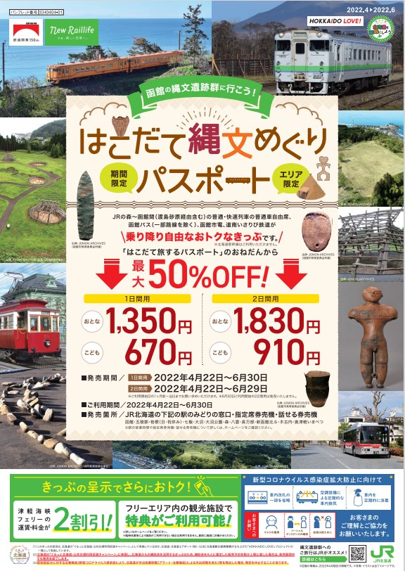 フリーエリア内のJR、函館バス、函館市電、道南いさりび鉄道が自由に乗り降りでき、さらに、フリーエリア内観光施設での特典、津軽海峡フェリーの運賃・料金が2割引になる特典がついたチケット「はこだて縄文めぐりパスポート」が販売開始となります。