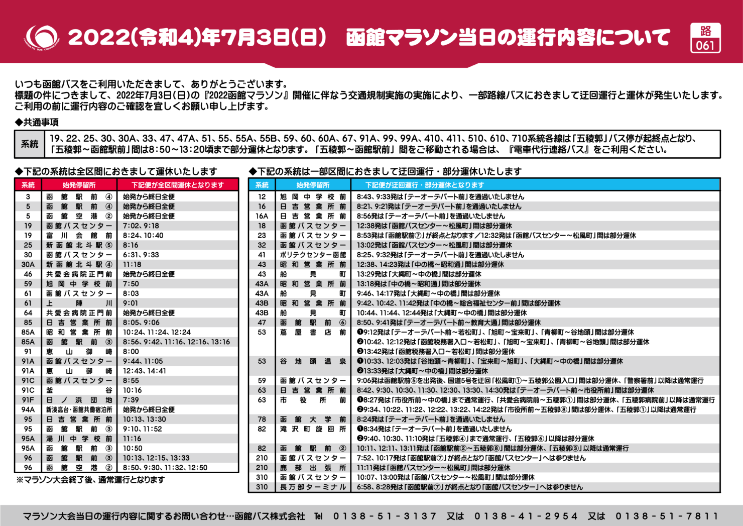 2022年7月3日(日)に「2022函館マラソン」が開催されるにあたり市内各所にて交通規制が実施されますことから、開催中の路線バスの運行が下記のとおり変更となります。バスをご利用の際は運行状況等をお確かめの上、ご利用くださいますようよろしくお願い申し上げます。