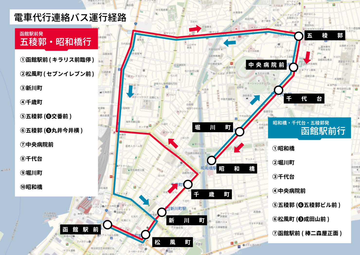 ◆上記部分運休に伴ない、「五稜郭~函館駅前」間を結ぶ『電車代行連絡シャトルバス』を運行いたします(下記❷)