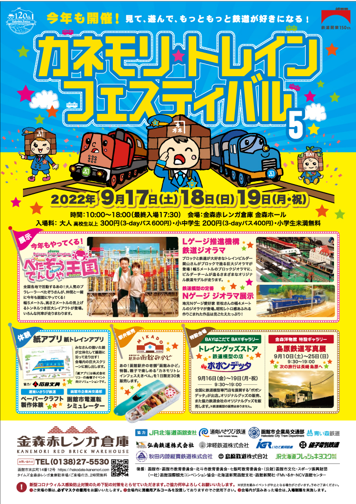 金森赤レンガ倉庫では、9月17日(土)~9月19日(月)の3日間、カネモリトレインフェスティバル5を開催!鉄道ジオラマの展示や函館市電運転シミュレーターなどの体験イベント、トレイングッズストア、鉄道写真展など子供から大人まで楽しめる内容になっています。