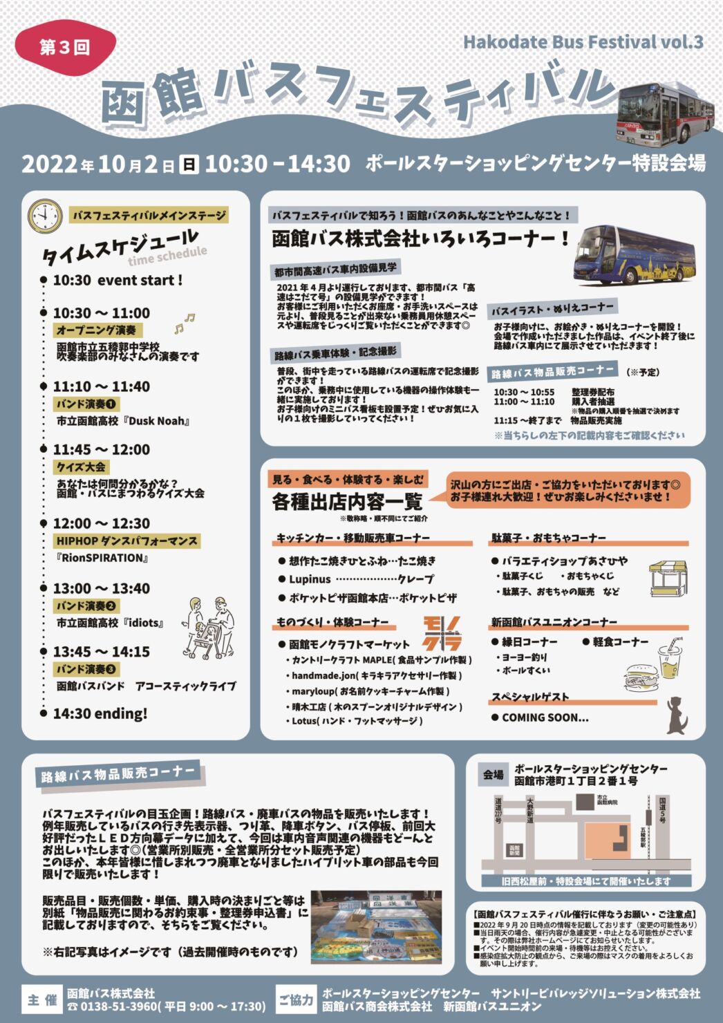 函館バスでは、10月2日(日)にポールスターショッピングセンター特設会場(旧西松屋前付近)で函館バスフェスティバルを開催!バンド演奏などのステージイベントや『都市間高速バス 高速はこだて号』専用車の車内見学、『路線バス物品販売』が行われます。詳細は下記チラシからご確認ください。(掲載情報は、2022年9月20日時点のものです)