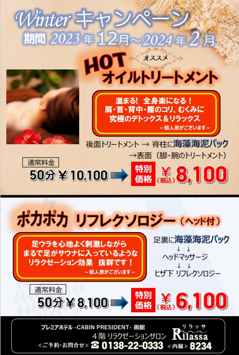 函館駅から僅か徒歩1分という立地にあるプレミアホテル-CABIN PRESIDENT-函館の4階に店舗を構えるリラクゼーションサロン「リラッサ函館」では、12月から2024年2月までの期間、リラクゼーション効果抜群の2コースを特別価格でご提供する“Winterキャンペーン”を開催しております!