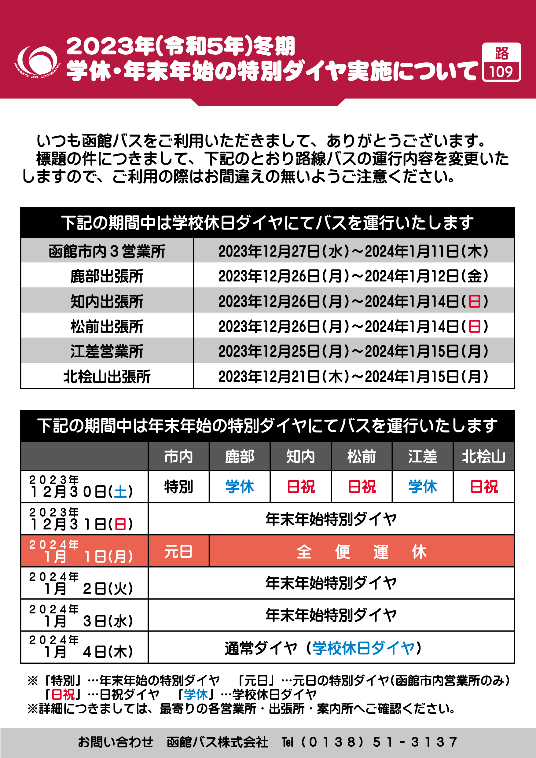 【路線バス】学校休日ダイヤと年末年始特別ダイヤの実施について函館バス