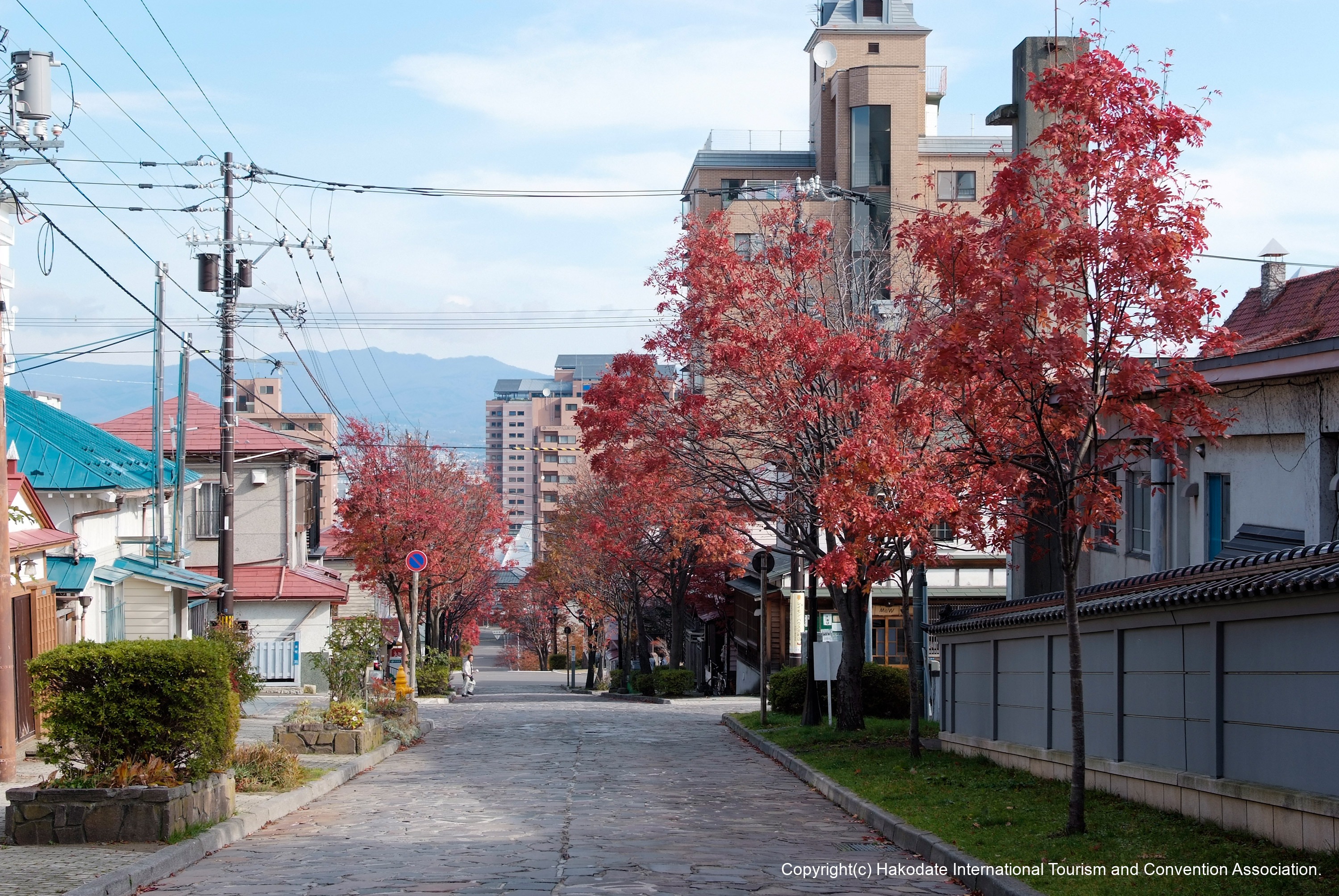 坂の入口に大三という家印の郷宿(ごうやど)があったのが坂名の由来。教会群へ続く石畳の坂道は秋にはナナカマドの実が赤く染まり風情がある。国土交通省が定める「日本の道100選」のひとつ。函館ハリストス正教会の横からさらに勾配が急になりアイヌ語で“おじいさん”を意味する「チャチャ登り」という名称に変わる。