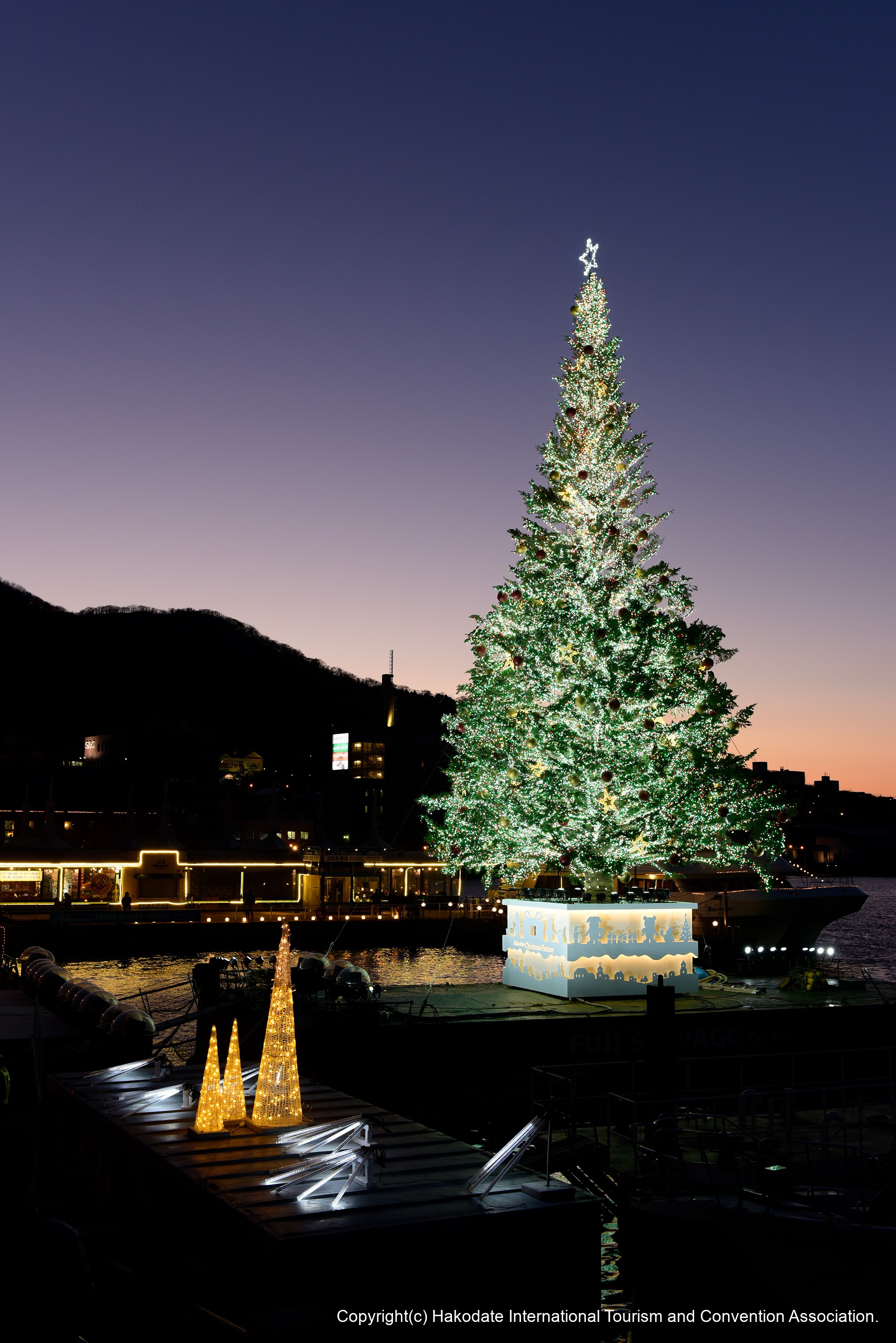姉妹都市カナダ・ハリファックス市から贈られる巨大なもみの木が約15万球のイルミネーションで輝き、赤レンガ倉庫群前の海上に浮かびます。毎夜の花火との共演が、幻想的な雰囲気を醸し出します。