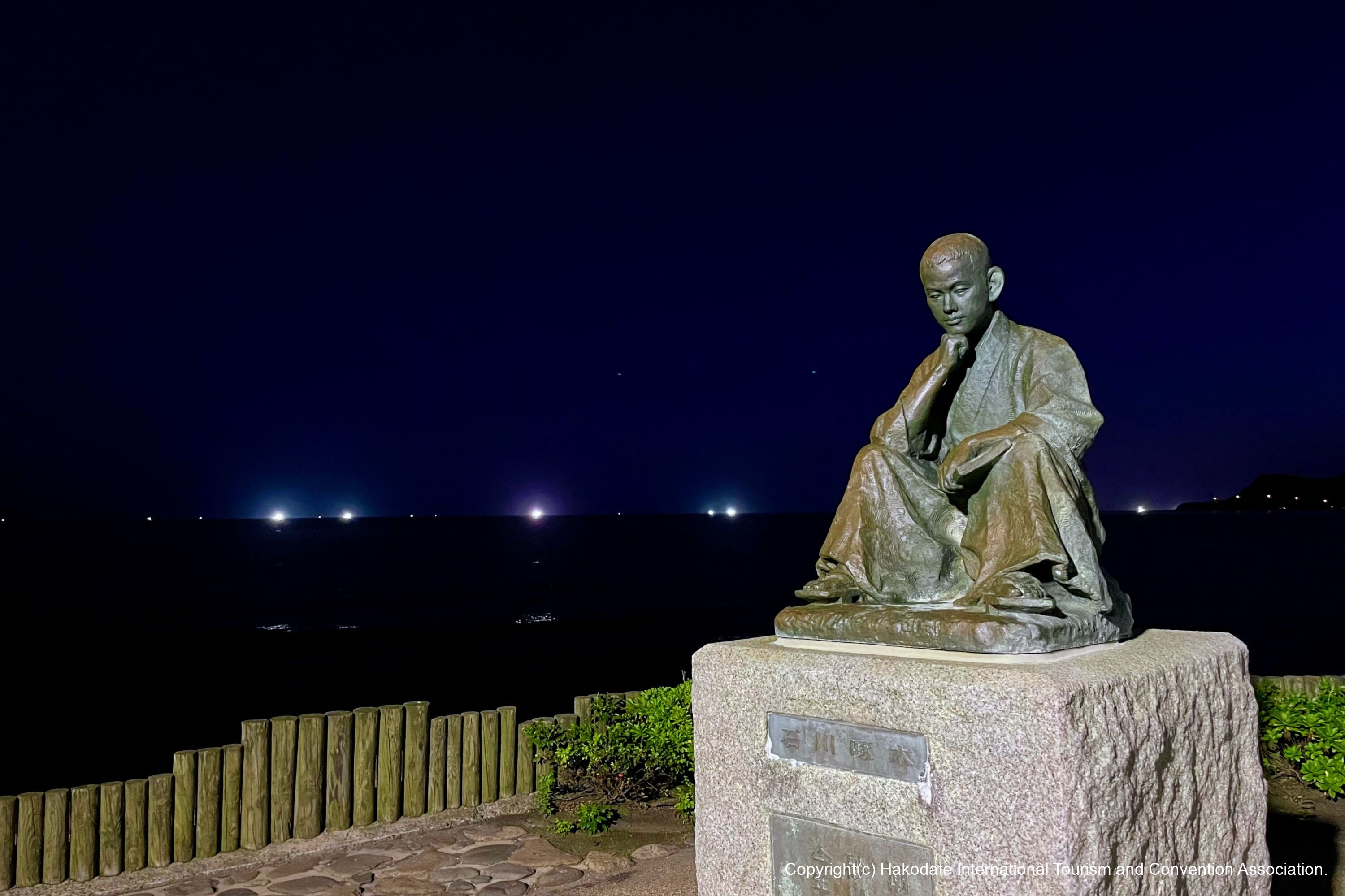 「死ぬ時は函館で死にたい」とまで言った歌人、石川啄木がこよなく愛した大森浜沿いに函館山を背にして啄木の座像が建っています。周辺は立待岬や津軽海峡などが望める絶景ポイントです。