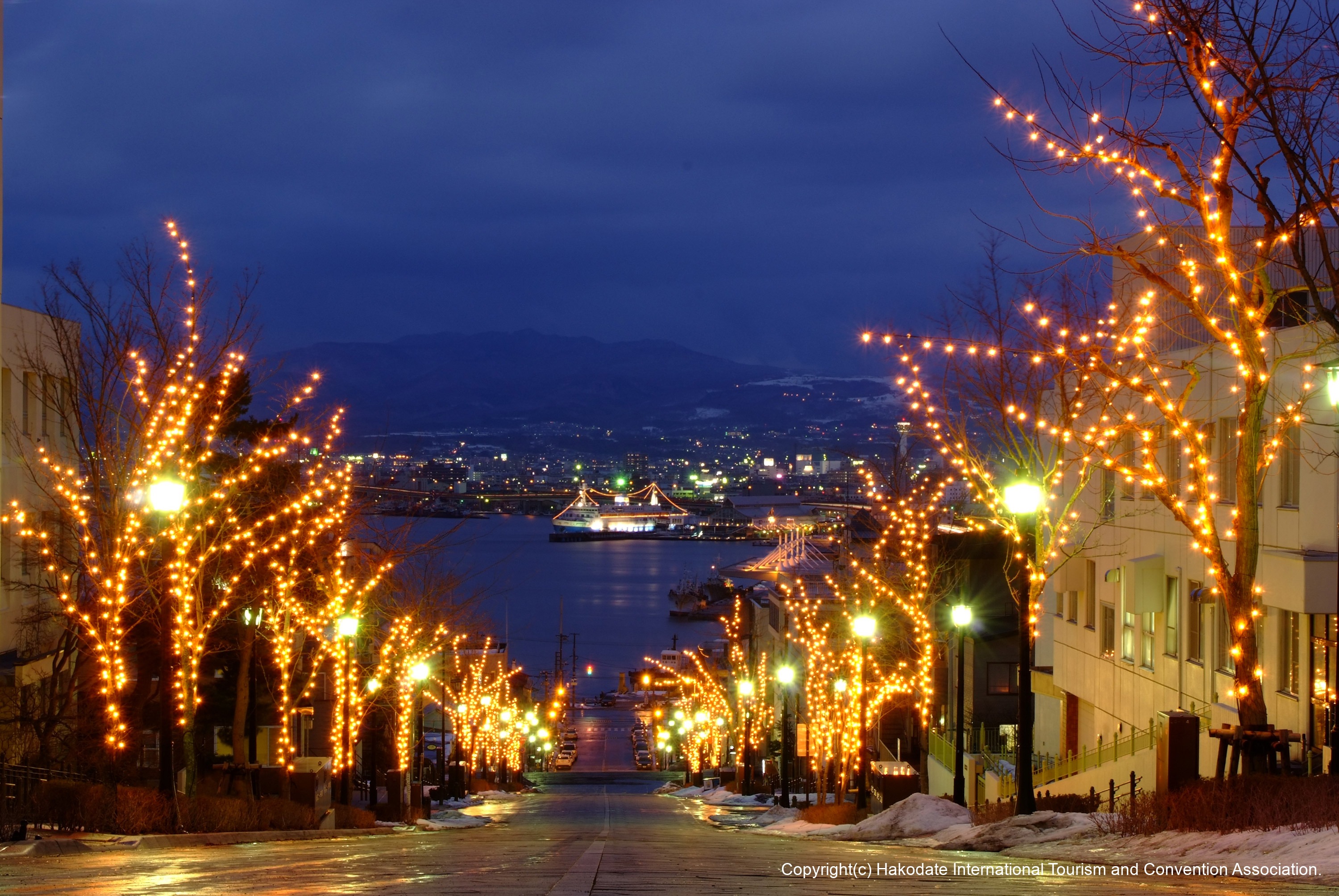 教会や和洋折衷住宅などが点在し異国情緒あふれる街並みを楽しめる元町地区を中心にあたたかい光が街を包み込みます。期間中は毎日点灯。今年の「はこだてイルミネーション」は計4か所で実施。映画、CM等のロケ地としても知られビュースポットでもある「八幡坂」、重要文化財旧函館区公会堂や旧イギリス領事館などの伝統的建築物が周辺にある「基坂」、幅が二十間(約36メートル)もある石畳の道が印象的な「二十間坂」と、二十間坂を下った先のベイエリア~朝市へ続く道である「開港通り」。それぞれのスポットごとに異なる景色をお楽しみください!!