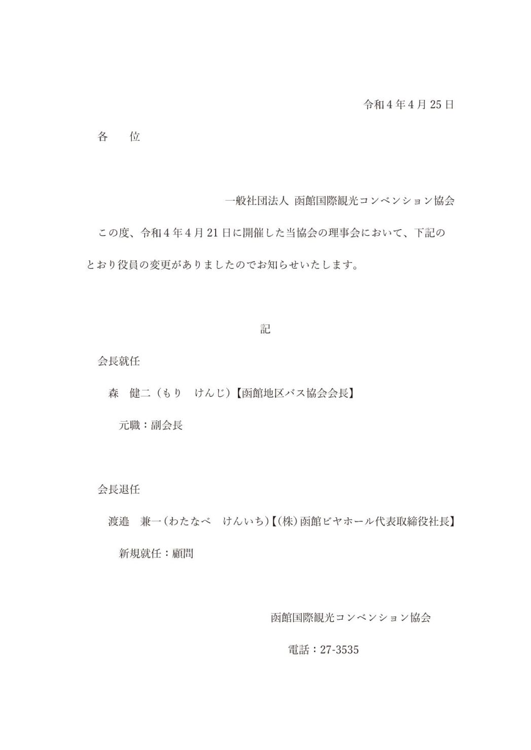 一般社団法人函館国際観光コンベンション協会 役員の変更について