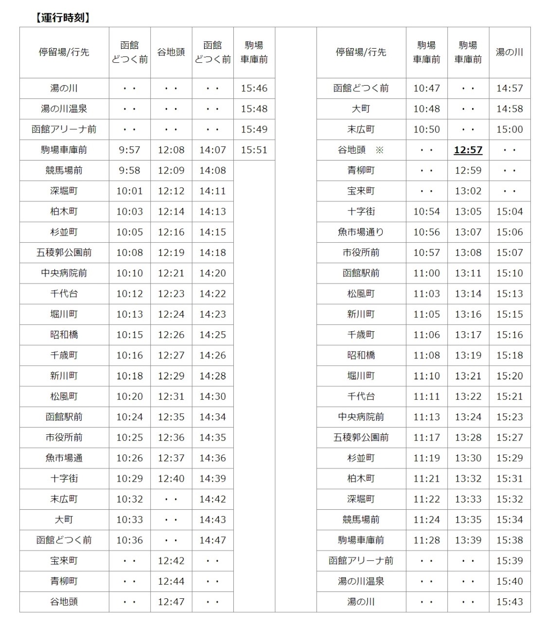 ※GW期間中は、「谷地頭」発車時刻が12時57分から12時56分に変更。