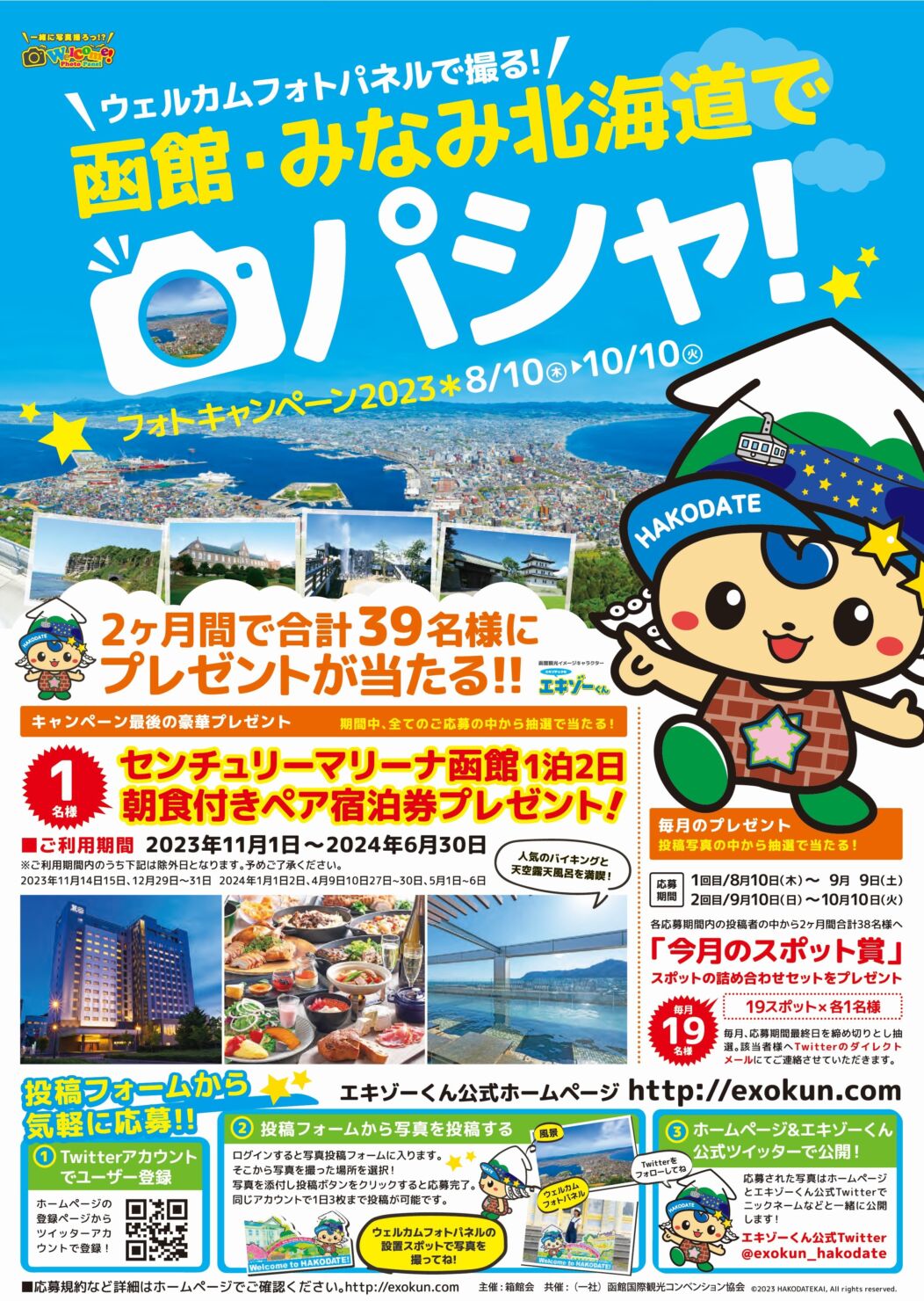 函館観光イメージキャラクター「エキゾーくん」のウェルカムフォトパネルで写真を撮って応募できるキャンペーンが開催中!2か月間で合計39名様にプレゼントが当たります。キャンペーン最後の豪華プレゼントとしてセンチュリーマリーナ函館1泊2日朝食付きペア宿泊券のプレゼントも♪