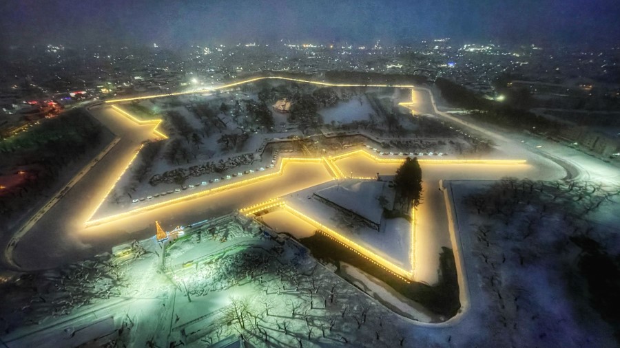 特別史跡五稜郭跡の堀の周囲1.8kmを約2,000個の電球で彩る「五稜星の夢(ほしのゆめ)イルミネーション」。期間中は毎日点灯されます。堀の周囲を歩きながら観賞できるほか、 五稜郭タワー展望台(入場には展望料金が必要)から景色を見下ろすと綺麗な星形のイルミネーションを確認することができます。日時、天候、積雪有無などの条件によって異なる雰囲気を見せるイルミネーションでもあり、見る人を楽しませてくれます。