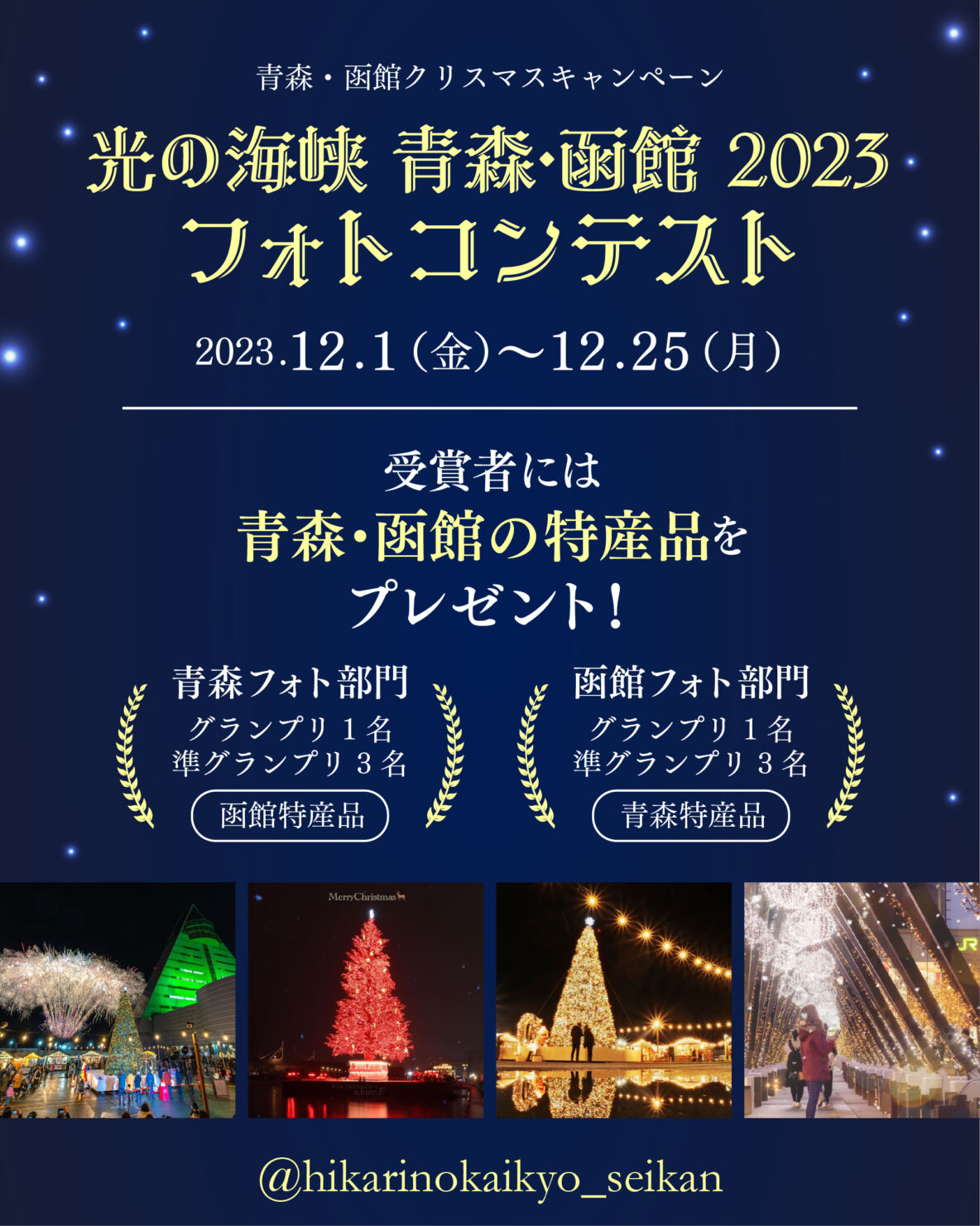 「光」をテーマとして、青森県と函館市の両地域で撮影された12月の冬と光の風景の写真を募集するフォトコンテスト。函館側はこのページで紹介されているイルミネーションすべて被写体として対象となります!12月25日までの限定開催ですので、イルミネーションの写真を撮った際はぜひご応募ください。詳細は青森県観光物産館アスパムHP上の応募方法をご確認ください。