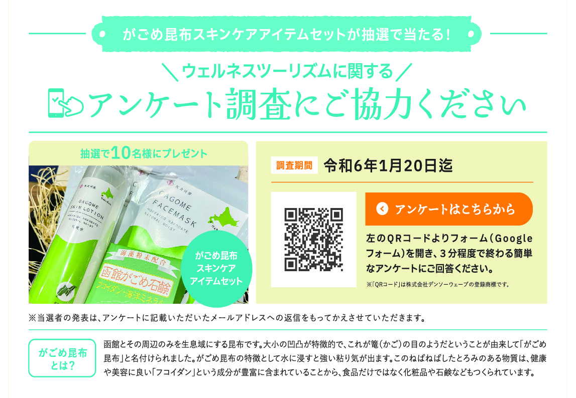 函館国際観光コンベンション協会では、函館西部地区で「ココロ」と「カラダ」を整えるウェルネスな旅のご提案「函館西部地区ウェルネスツーリズム」をより魅力的なコンテンツに磨き上げるため、皆様のご意見を頂戴したく、現在、アンケート調査を実施中です。回答の御礼として抽選で当たるプレゼントもご用意しておりますので、是非ともご協力をお願いします!