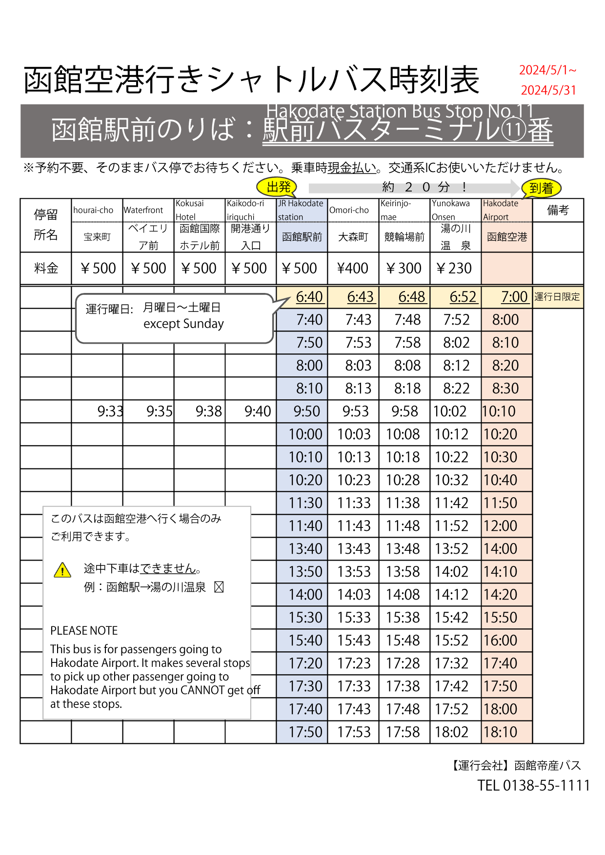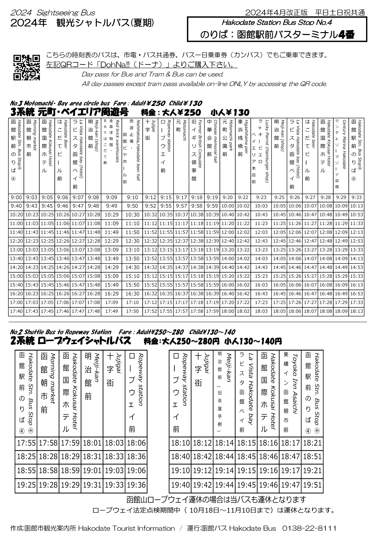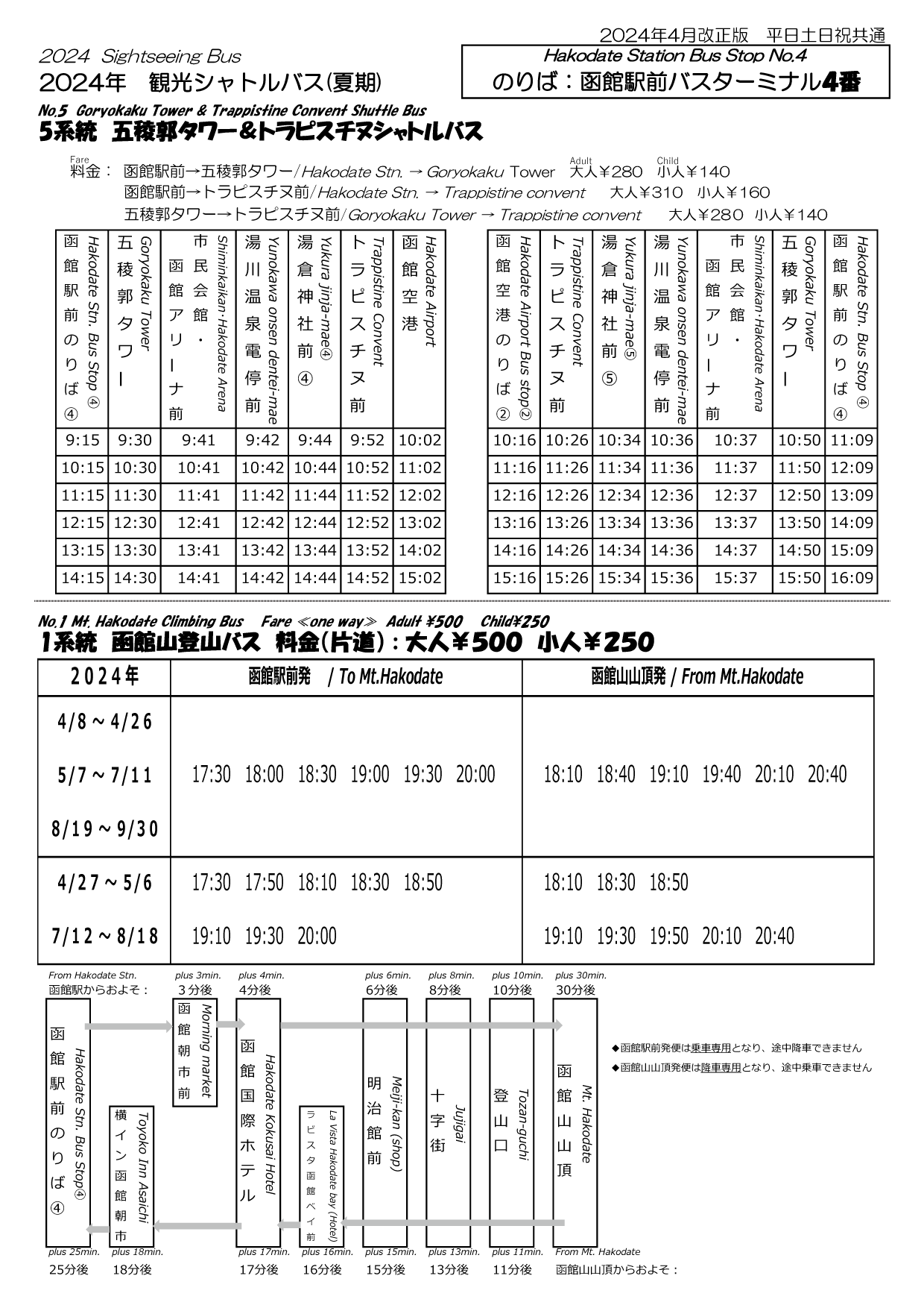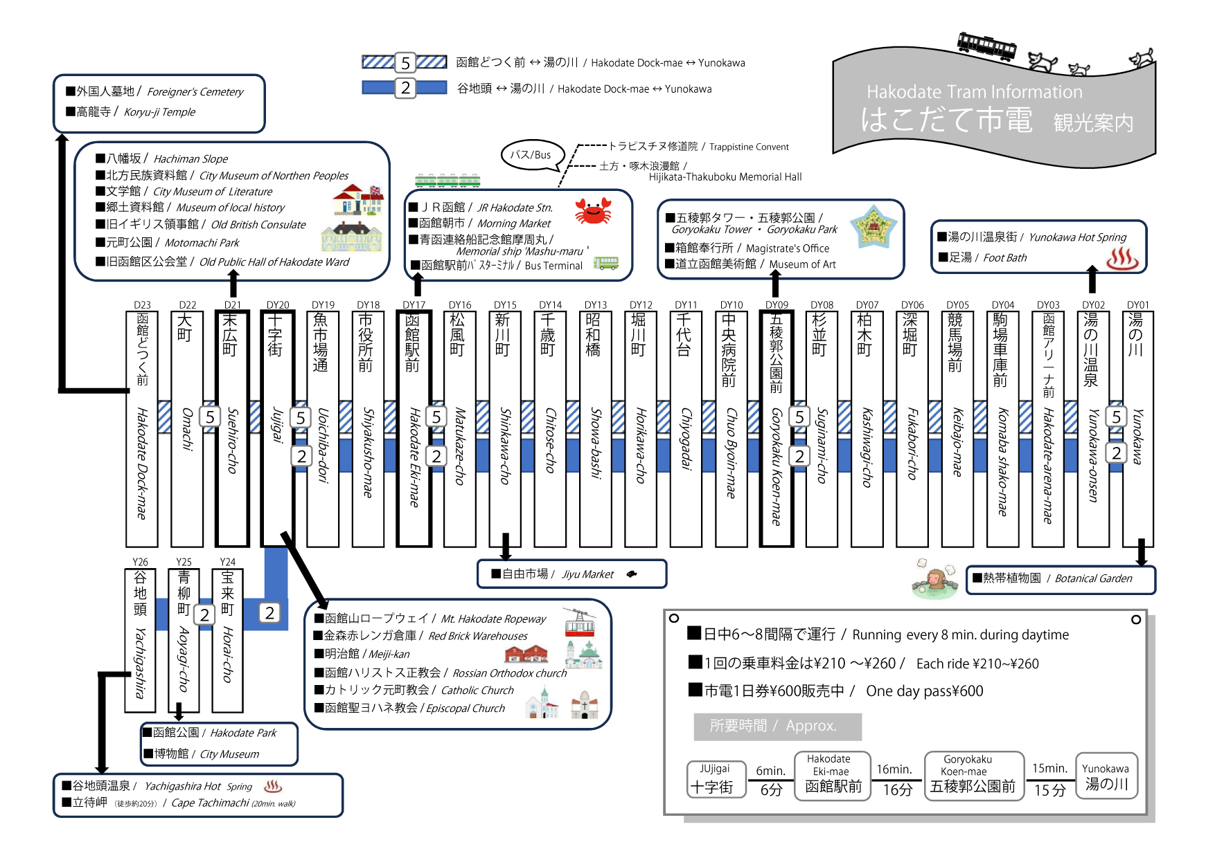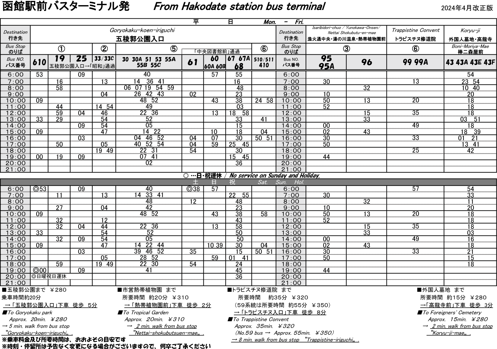 函館市観光案内所内で掲示しております、駅前・元町、五稜郭、湯の川温泉など各観光地を周遊する際に利用できる公共交通の時刻表等をこのページでも掲載しております。時刻表などは画像およびPDFファイルを掲載しているので、拡大表示をしてご確認ください。