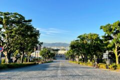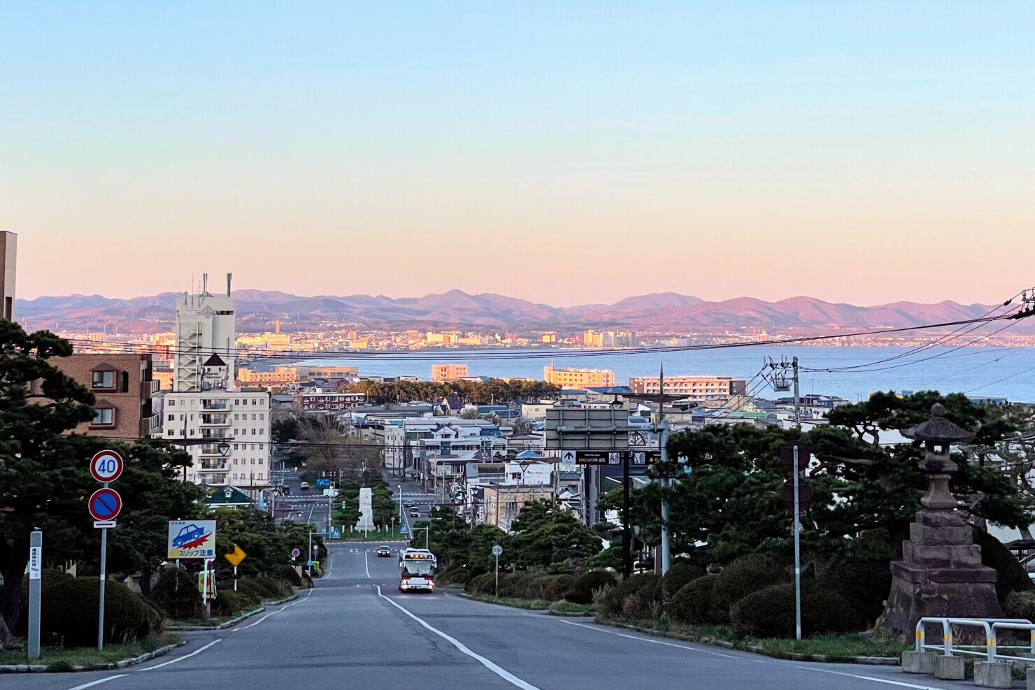 「縁結び」のパワースポットでもある函館護國神社の下に伸びる坂道。市街と湯の川温泉方面へ続く浜辺が見える景色が見所です。