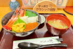 函館駅から徒歩1分の函館朝市どんぶり横丁内にあります。函館朝市内に店を構える弥生水産の直営で、新鮮な魚介類を使った料理を味わうことができる食堂です。海鮮丼の他、焼き魚や刺身の定食もあります。おすすめは無添加自家製いくら醬油漬で、店内でお土産用に購入することもできます。
